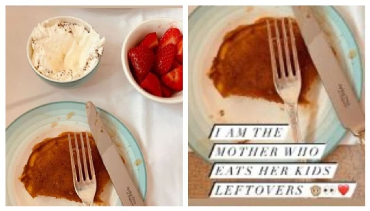 ചിത്രത്തിൽ പകുതി പാൻകേക്ക് കാണാൻ പറ്റുന്നതാണ്. ഒരു ബൗളിൽ അരിഞ്ഞ് വച്ചിരിക്കുന്ന സ്ട്രോബെറിയും ഒരു ബൗളിൽ ക്രീമും ഇരിക്കുന്നത് കാണാവുന്നതാണ്. കുഞ്ഞ് ബാക്കി വച്ച ഭക്ഷണം കഴിക്കുന്ന അമ്മയാണ് ഞാൻ എന്ന് കുറിച്ച് കൊണ്ടാണ് കരീന ചിത്രം പങ്കുവച്ചിരിക്കുന്നത്.