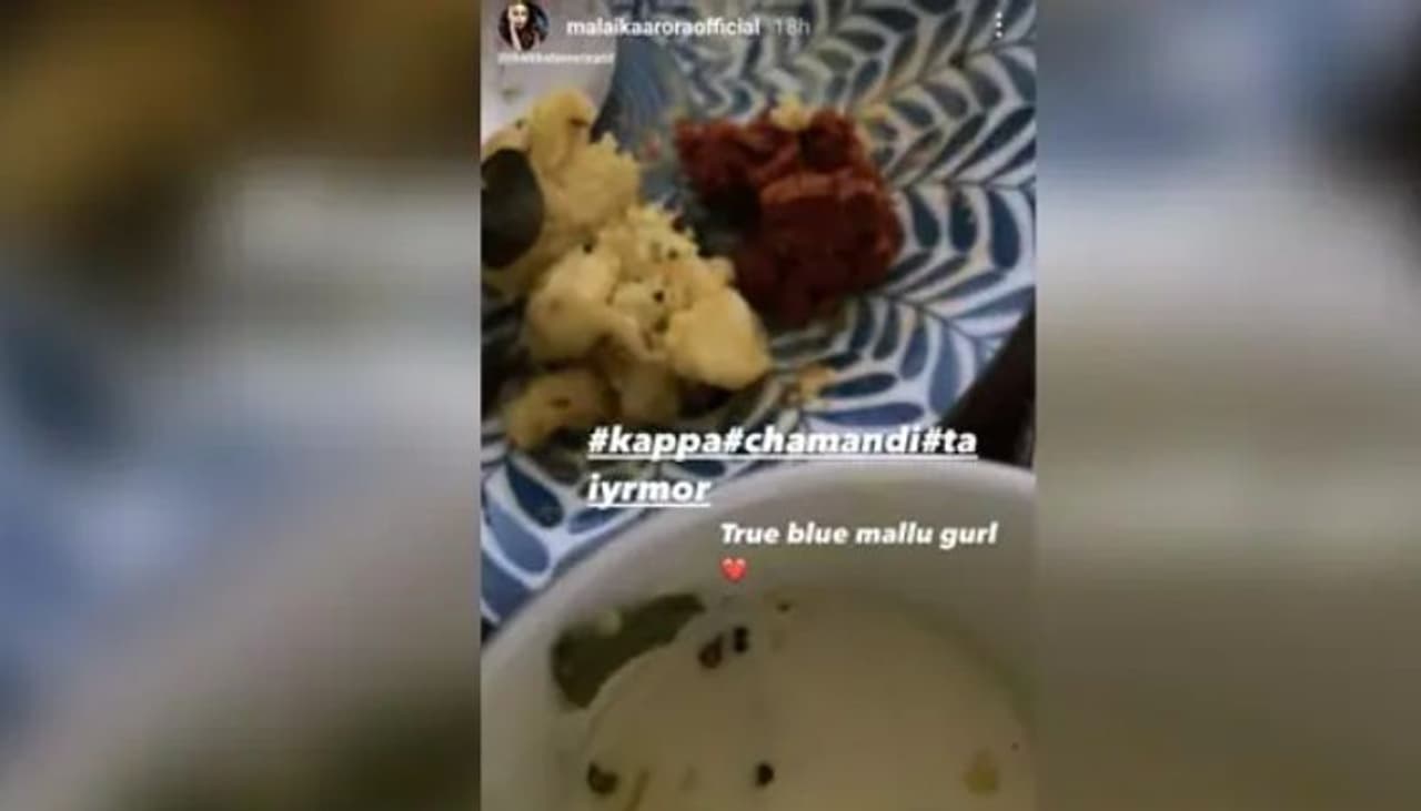 ഇപ്പോഴിതാ മലയാളികളുടെ പ്രിയപ്പെട്ട, കേരളത്തിന്റെ സ്വന്തം വിഭവമായ കപ്പയും ചമ്മന്തിയും കഴിക്കുന്നതിന്റെ ചിത്രം പങ്കുവച്ചിരിക്കുകയാണ് മലൈക. ഇന്സ്റ്റഗ്രാമില് സ്റ്റോറിയിലൂടെയാണ് താരം ചിത്രം പങ്കുവച്ചത്. ചുവന്ന ഹാര്ട്ട് ഇമോജിയോടൊപ്പം 'ശരിക്കും മലയാളി പെണ്കുട്ടി തന്നെ' എന്ന ക്യാപ്ഷനോടെയാണ് മലൈക ചിത്രം പങ്കുവച്ചിരിക്കുന്നത്.