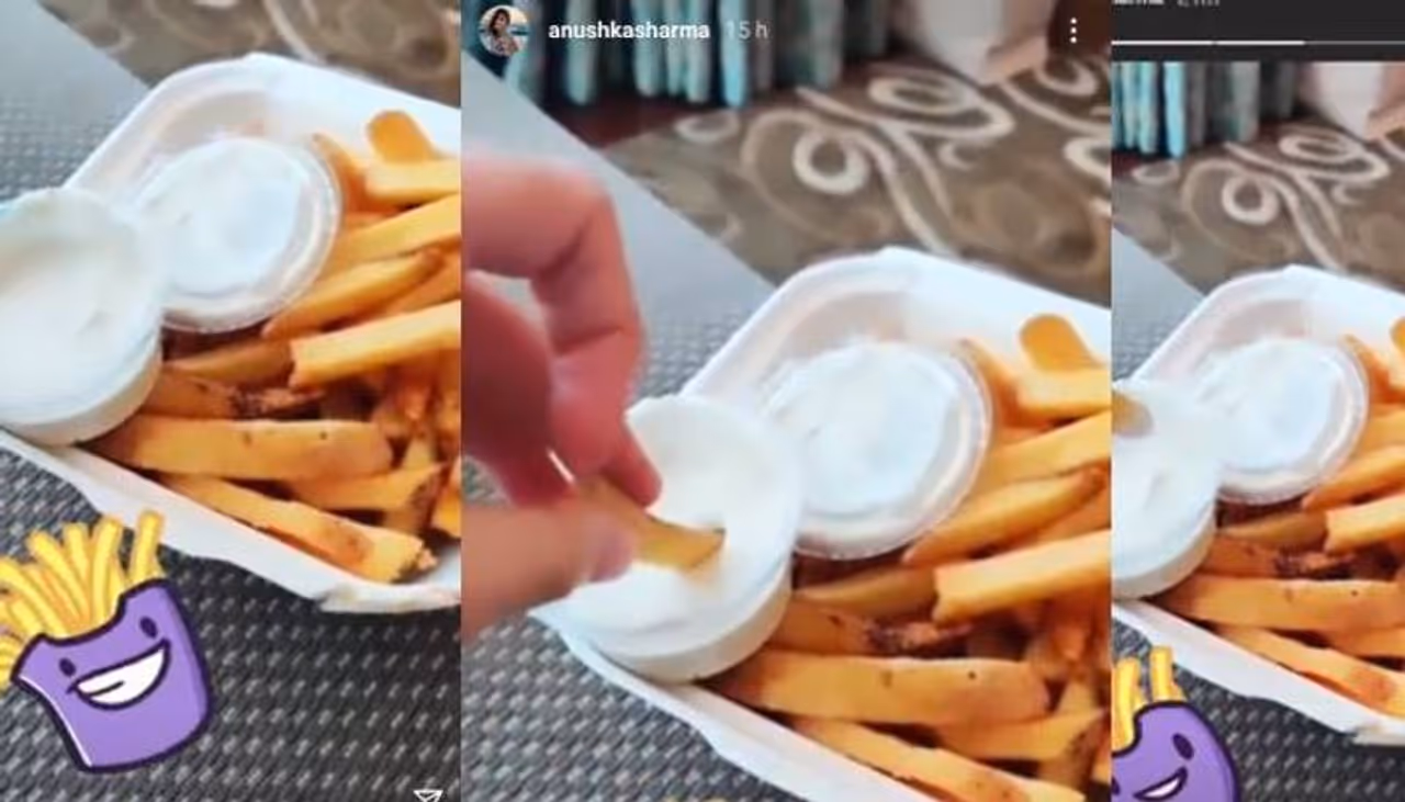 ഫ്രഞ്ച് ഫ്രൈസ് മയണൈസില് മുക്കി കഴിക്കുകയാണ് അനുഷ്ക. വീഡിയോയുടെ സ്ക്രീന്ഷോട്ടുകളാണ് ഇപ്പോള് സമൂഹ മാധ്യമങ്ങളില് പ്രചരിക്കുന്നത്.