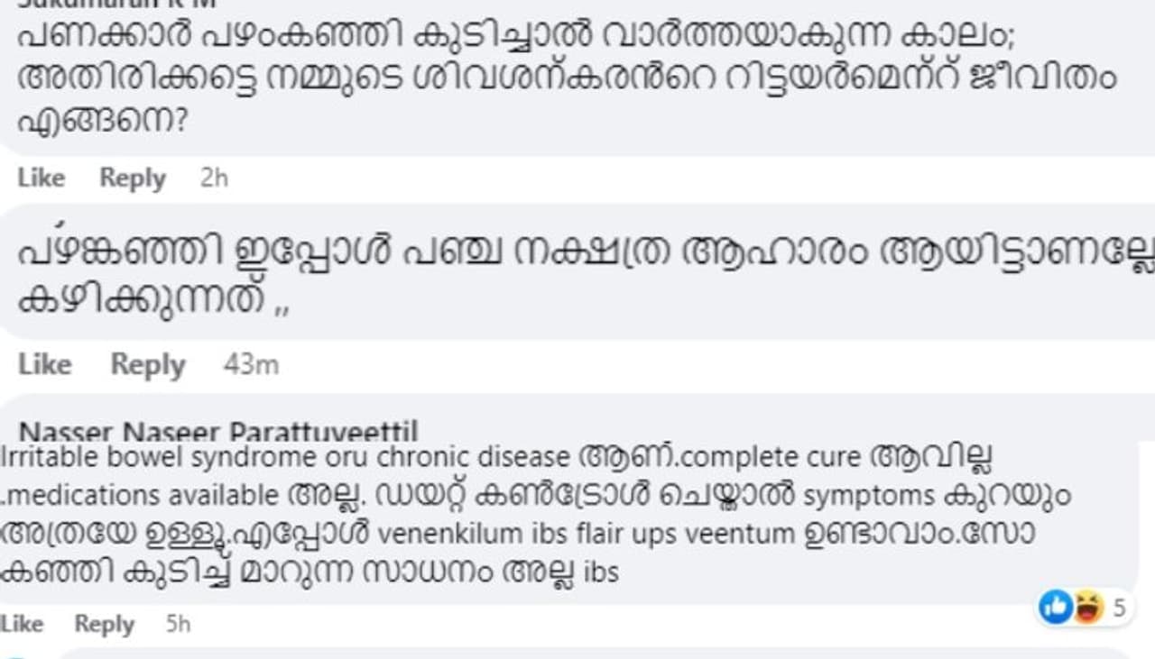 ശ്രീധര് വെമ്പുവിന്റെ ട്വീറ്റിനെ കുറിച്ചുള്ള വാര്ത്തകള്ക്ക് താഴെയും അദ്ദേഹത്തിന്റെ ട്വീറ്റിന് താഴെയും തന്നെ പലരും ഇക്കാര്യം ചൂണ്ടിക്കാട്ടുന്നുണ്ട്. ട്വീറ്റിന് താഴെ പക്ഷേ അധികപേരും ശ്രീധര് വെമ്പുവിനെ പിന്തുണച്ചും പ്രശംസിച്ചുമാണ് കമന്റ് ചെയ്തിരിക്കുന്നത്. ഐബിഎസ് പോലുള്ള ദഹനവ്യവസ്ഥയെ ബാധിക്കുന്ന അസാധാരണമായ അവസ്ഥകളില് ഡയറ്റിന് വലിയ പ്രാധാന്യമുണ്ട്. കഞ്ഞി പോലുള്ള ഭക്ഷണം മിതമായ രീതിയില് കഴിക്കുന്നത് ഇതിന്റെ അനുബന്ധ പ്രശ്നങ്ങളെ ലഘൂകരിക്കാം. എന്നാല് രോഗം ഭേദപ്പെടുത്താൻ സാധിക്കില്ലെന്നും അതുപോലെ കഞ്ഞി അമിതമായാല് വണ്ണം വയ്ക്കുമെന്നും ചിലര് മാത്രം ചൂണ്ടിക്കാട്ടുന്നു.