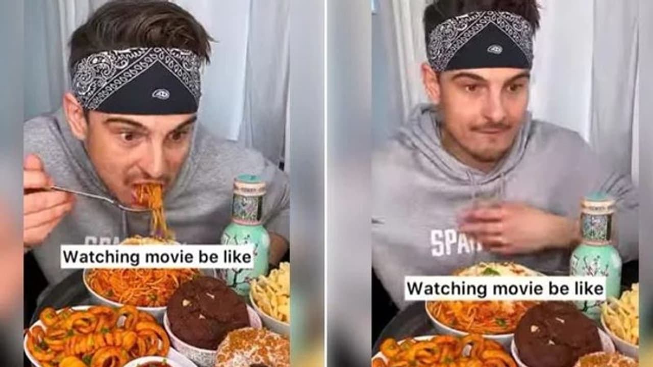 ഇഷ്ടപ്പെട്ട സിനിമ ഓണ് ചെയ്ത് വച്ച ശേഷം ധാരാളം വിഭവങ്ങള് കഴിക്കാനൊരുങ്ങുന്ന യുവാവാണ് വീഡിയോയിലുള്ളത്. സിനിമയും കണ്ട് ഭക്ഷണം ആസ്വദിച്ച് കഴിക്കാനാണ് യുവാവിന്റെ തയ്യാറെടുപ്പെന്നാണ് നമ്മളാദ്യം കരുതുക. പക്ഷേ, സിനിമ തുടങ്ങുന്നതിനെ സൂചിപ്പിക്കുന്ന ടൈറ്റില് മ്യൂസിക് അവസാനിക്കും മുമ്പ് തന്നെ അദ്ദേഹം മുഴുവന് വിഭവങ്ങളും കഴിച്ചുതീര്ക്കുകയാണ്. ഭക്ഷണം തീര്ന്നുപോയത് പോലും അദ്ദേഹം അറിയുന്നുമില്ല.