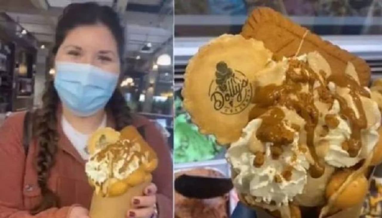 ''ഒരു ഡെസേർട്ട് കഴിക്കാനായി നിങ്ങൾ എത്ര ദൂരം യാത്ര ചെയ്യും? ഈ കസ്റ്റമർ കേംബ്രിഡ്ജിൽ നിന്ന് വന്നതാണ്..നാല് മണിക്കൂർ യാത്ര ചെയ്ത്"- ഷോപ്പിലെ ജീവനക്കാരൻ പറയുന്നു. ബബിൾഡ് വാഫ്ളെ വിത്ത് ഐസ്ക്രീം, കിൻഡർ ബ്യൂണോ സോസ്, വിപ്പ്ഡ് ക്രീം, ഒരു ലോട്ടസ് ബിസ്കോഫ് ബിസ്കറ്റ്, ബിസ്കോഫ് സോസ് എന്നിവ നിറഞ്ഞ പുഡ്ഡിങ്ങാണ് വിക്കി കഴിക്കാനായി വാങ്ങിയത്.