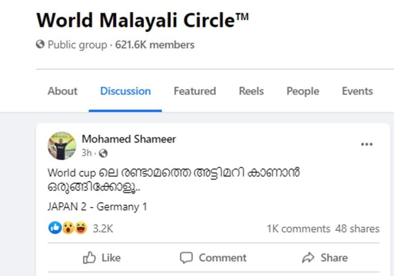 ഷമീറിന്റെ പ്രവചനം പോലെ മത്സരത്തില് ജര്മനി 2-1ന് തോല്ക്കുയും ചെയ്തു. ഇന്നലെ ഇതേ ഫേസ്ബുക്ക് ഗ്രൂപ്പില് മധു മണക്കാട്ടില് എന്ന ആരാധകര് അര്ജന്റീന-സൗദി അറേബ്യ മത്സരത്തിന്റെ ഫലവും സ്കോര് നിലയും കൃത്യമായി പ്രവചിച്ച് താരമായിരുന്നു.