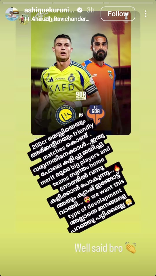 200 കോടിക്ക് മെസിയെയും അര്ജന്റീനയയെയും സൗഹൃദ മത്സരം കളിക്കാന്കൊണ്ടുവരുന്നതിനെക്കാള് കളിച്ചു ജയിച്ച് മെറിറ്റിലൂടെ വലിയ താരങ്ങളെ സ്വന്തം ഗ്രൗണ്ടില് കൊണ്ട് വന്ന് കളിക്കാന് പോകുന്നു. അതും പൈസ ഇങ്ങോട്ട് വാങ്ങി. ഇത്തരത്തിലുള്ള ഫുട്ബോള് വികസനമാണ് നമുക്ക് വേണ്ടത്. അല്ലാതെ ജനങ്ങളെ പറിഞ്ഞു പറ്റിക്കലല്ല എന്നായിരുന്നു ഏഷ്യൻ ചാമ്പ്യൻസ് ലീഗില് എഫ് സി ഗോവയുമായി മത്സരിക്കാന് ക്രിസ്റ്റ്യാനൊ റൊണാള്ഡോയുടെ അല് നസ്ർ ഗോവയിലെത്തുമെന്ന വാര്ത്തയോടുള്ള പ്രതികരണമായി ആഷിക് കുരുണിയന് ഇന്സ്റ്റഗ്രാമില് കുറിച്ചത്.
