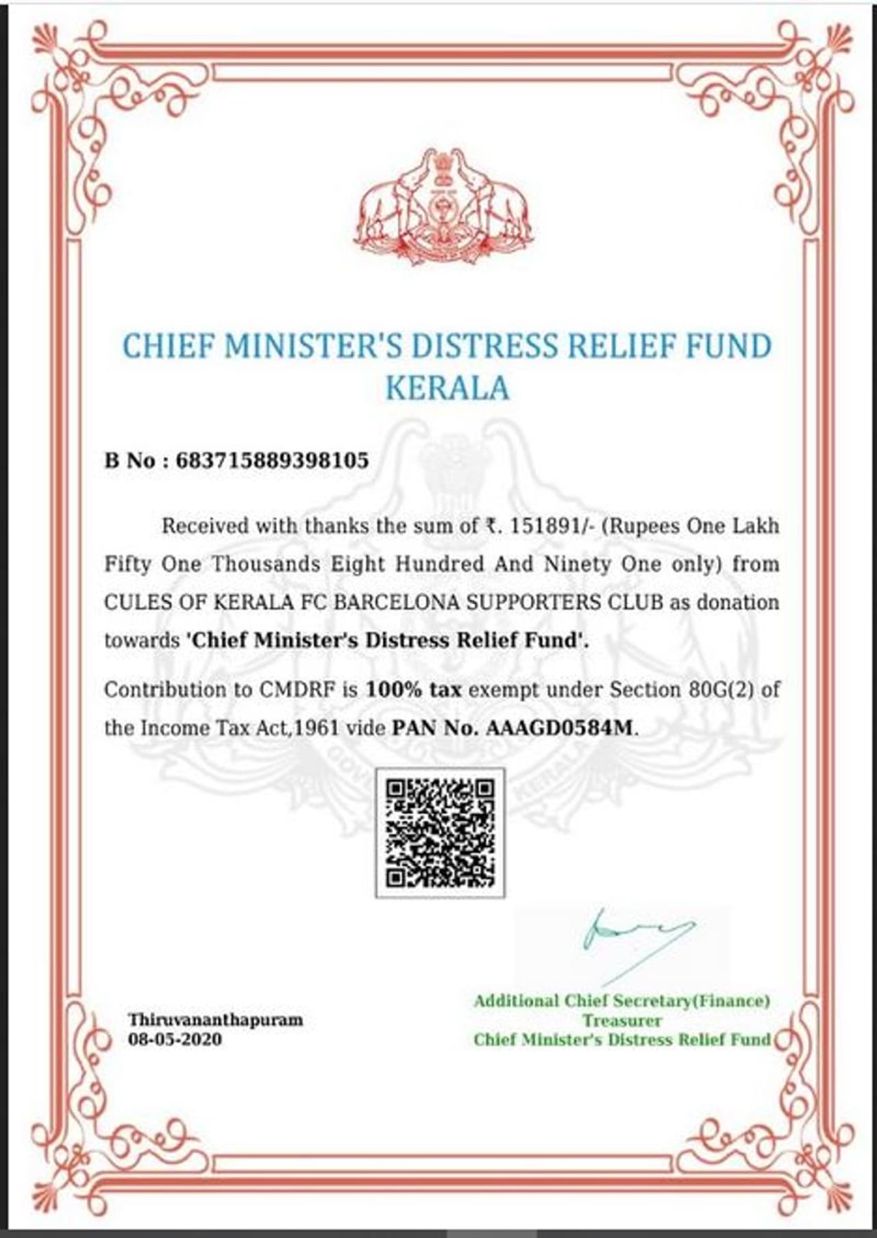 തിരുവനന്തപുരം: കൊവിഡ് പ്രതിരോധത്തിന്റെ ഭാഗമായി സ്പാനിഷ് ക്ലബ് എഫ്സി ബാഴ്സലോണയുടെ കേരളത്തിലെ ആരാധക കൂട്ടായ്മയായ കൂളെസ് ഓഫ് കേരള ഇതുവരെ സമാഹരിച്ച തുക മുഖ്യമന്ത്രിയുടെ ദുരിതാശ്വാസ നിധിയിലേക്ക് കൈമാറി. കഴിഞ്ഞ നാല് ദിവസങ്ങളിൽ നിന്നായി സമാഹരിച്ച 1,51, 891 രൂപയാണ് ഇന്ന് കൈമാറിയത്. മുൻപ് കൂളെസ് ഓഫ് കേരളയുടെ ഭാരവാഹികളിൽ നിന്നും സുഹൃത്തുക്കളിൽ നിന്നും സമാഹരിച്ച 13,000 രൂപയും നൽകിയിരുന്നു. കൂളെസ് ഓഫ് കേരളയുടെ ഫേസ്ബുക്ക് പേജ്, വാട്സ്ആപ്പ് ഗ്രൂപ്പുകൾ വഴിയാണ് ധനശേഖരണം നടത്തിയത്.
