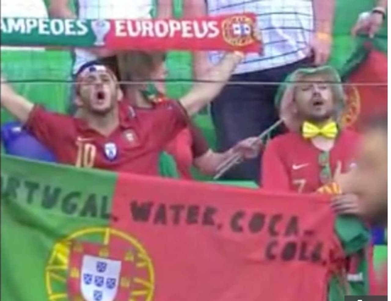 കഴിഞ്ഞ ദിവസം ജര്മനിക്കെതിരായ മത്സരത്തിനിടെ റൊണാള്ഡോയുടെ കോക്ക കോള സംഭവുമായി ബന്ധപ്പെട്ട് പോര്ച്ചുഗീസ് ആരാധകര് ഗാലറിയില് ബാനര് ഉയര്ത്തിയതാണ് പുതിയ സംഭവം എന്ന് ഇംഗ്ലീഷ് മാധ്യമങ്ങള്