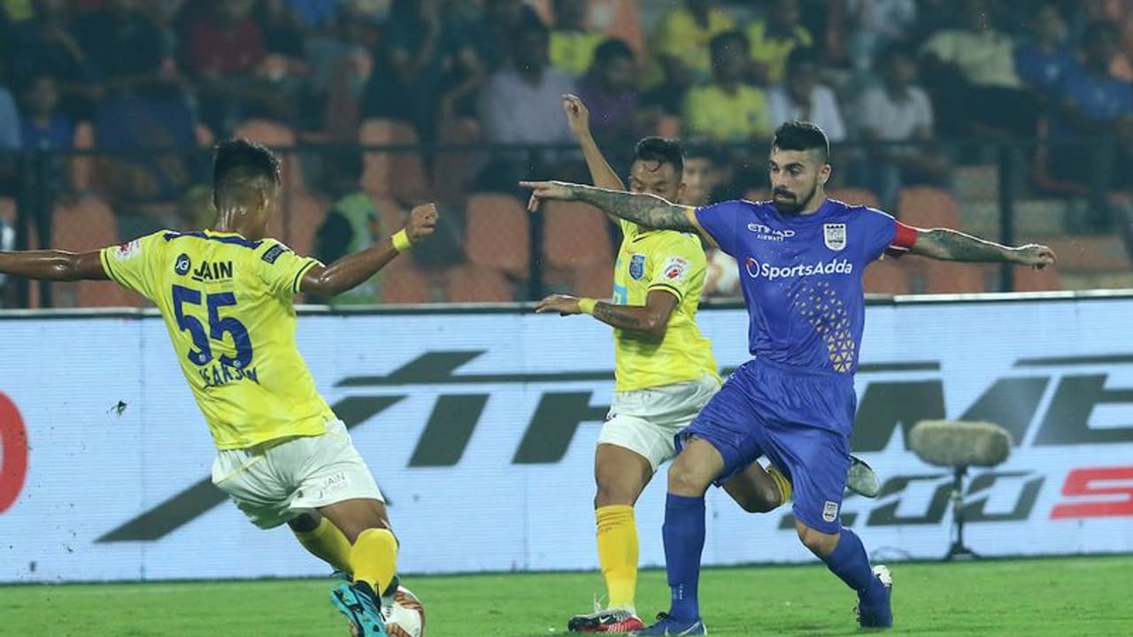 33–-ാം മിനിറ്റിൽ കർണെയ്റോയുടെ പാസിൽ സെയ്ത്യാസെൻ ഷോട്ട് പായിച്ചെങ്കിലും അമരീന്ദർ സേവ് ചെയ്തു. മുംബൈയും ഇടയ്ക്ക് മുന്നേറ്റം നടത്തി. മോദു സോഗുവിന്റെ കനത്ത അടി രെഹ്നേഷ് തട്ടിയകറ്റി. 42–-ാം മിനിറ്റിലും സോഗുവിനെ രെഹ്നേഷ് തടഞ്ഞു. ആദ്യപകുതി ഗോളില്ലാതെ അവസാനിച്ചു. രണ്ടാംപകുതിയുടെ തുടക്കത്തിൽ മെസി ബൗളിയുടെ ഗോളിലേക്കുള്ള നീക്കത്തെ മുംബൈ ഡിഫൻഡർ പ്രതീക് ചൗധരി തടയിട്ടു. ഗോൾ കീപ്പർ ടി പി രെഹ്നേഷിന്റെ പ്രകടനങ്ങളായിരുന്നു തുടർന്നുള്ള നിമിഷങ്ങളിൽ മുംബൈയെ തടഞ്ഞത്. വലയ്ക്ക് മുന്നിൽ ഒന്നാന്തരം പ്രകടനം രെഹ്നേഷ് പുറത്തെടുത്തു. ബിപിൻ സിങ്ങിനെയും അമിനെ ചെർമിറ്റിയെയും വലയ്ക്കരിലേക്ക് അടുപ്പിച്ചില്ല.