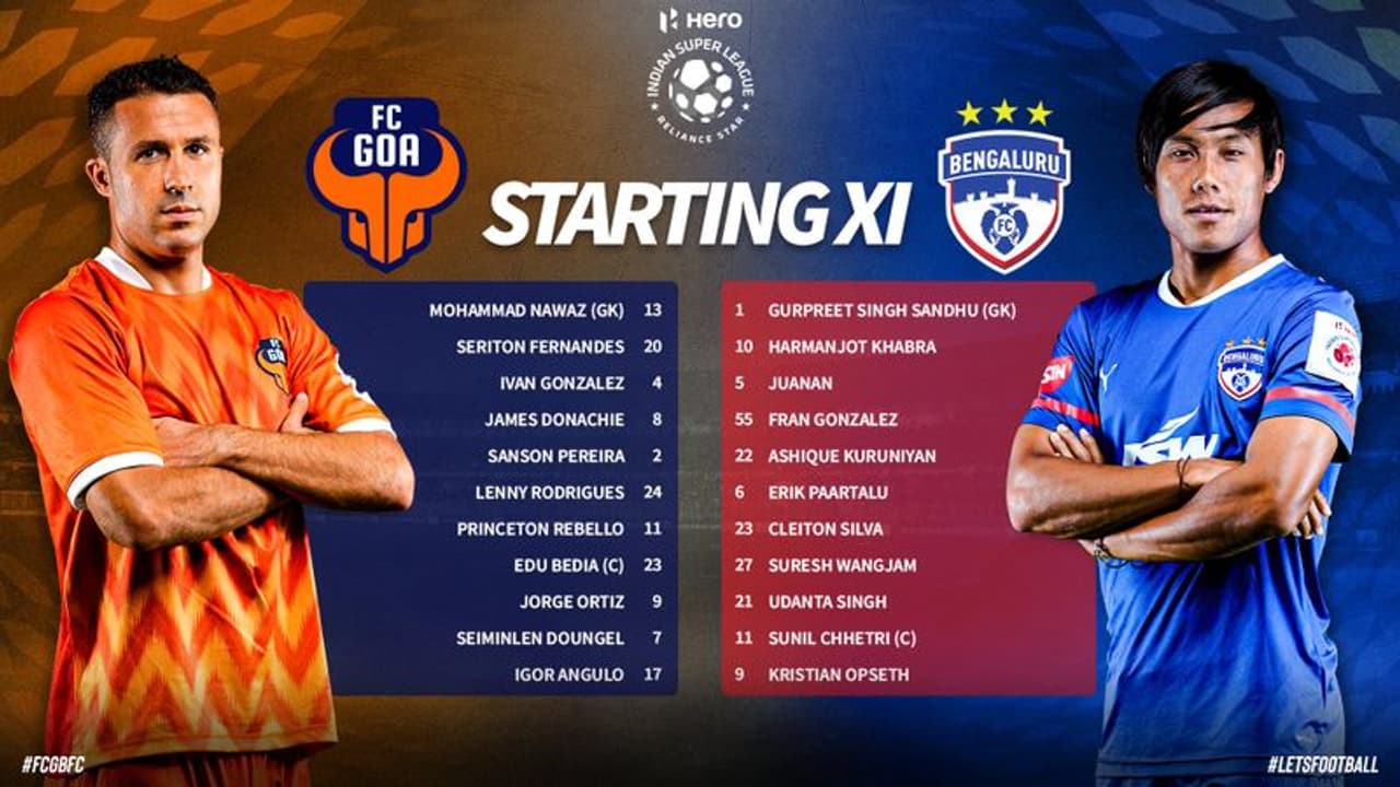 വമ്പന് പോരാട്ടത്തില് യുവാൻ ഫെറാൻഡോ പരിശീലിപ്പിക്കുന്ന ഗോവ 4-2-3-1 ശൈലിയിലും കാർലെസ് കോഡ്രാറ്റിന്റെ ബെംഗളൂരു 3-4-3 ഫോര്മേഷനിലുമാണ് ടീമിനെ ഇറക്കിയത്. ബെംഗളൂരു മലയാളി താരം ആഷിഖ് കുരുണിയന് ആദ്യ ഇലവനില് അവസരം നല്കിയെന്നതും ശ്രദ്ധേയം.