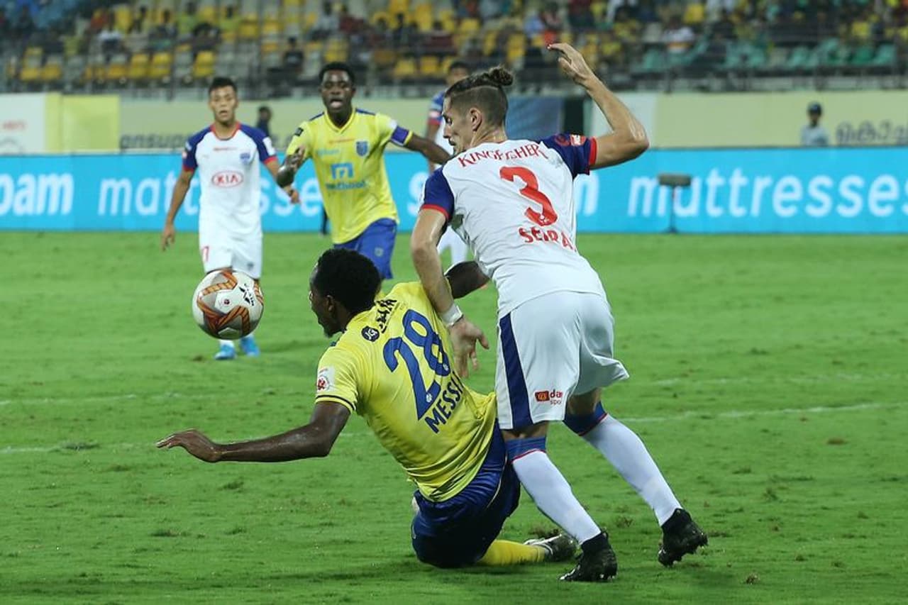 ബെംഗളൂരിന്റെ മുന്നേറ്റത്തോടെയാണ് കളി തുടങ്ങിയത്. സന്ദര്ശകരുടെ തുടര്ച്ചയായ ശ്രമങ്ങള്ക്ക് ബ്ലാസ്റ്റേഴ്സ് തടയിട്ടു. പതിയെ ബ്ലാസ്റ്റേഴ്സ് പന്തില് ആധിപത്യം സ്ഥാപിച്ചു തുടങ്ങി. മധ്യനിരയില് സിഡോഞ്ച സുന്ദരമായി കളി മെനഞ്ഞു. പത്താം മിനുറ്റില് സിഡോഞ്ച നല്കിയ പന്ത് ബോക്സിന് പുറത്ത് നിന്ന് സ്വീകരിച്ച് വല ലക്ഷ്യമാക്കി കുതിച്ച മെസി ബൗളിക്ക് പാര്ത്താലു കോര്ണറിന് വഴങ്ങി സമര്ഥമായി തടയിട്ടു.