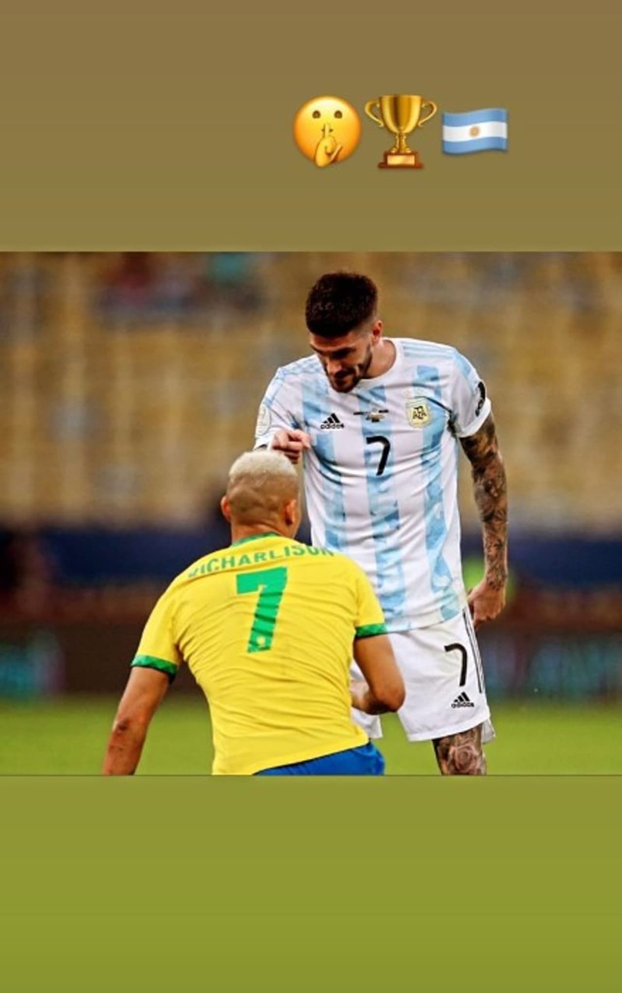 എന്തായാലും ഈ പരിഹാസം അര്ജന്റീനയുടെ മധ്യനിര താരം റോഡ്രിഗോ ഡി പോളിന് അത്രയ്ക്ക് രസിച്ചില്ല. താരം അതിനുള്ള മറുപടിയുമായെത്തി. പകരം ഒരു ചിത്രമാണ് തന്റെ ഇന്സ്റ്റഗ്രാം ഹാന്ഡിലില് ഡി പോള് പങ്കുവച്ചത്. കോപ്പ ഫൈനലിനിടെ റിച്ചാര്ലിസണ് ഡി പോളിന് മുന്നില് മുട്ടുകുത്തി നില്ക്കുന്ന ചിത്രമായിരുന്നു അത്. ബ്രസീലിയന് താരത്തോട് മിണ്ടരുത് അംഗ്യത്തോടെ കാണിക്കുന്നതും ചിത്രത്തില് കാണാം. അര്ജന്റീനയുടെ പതാകയും ട്രോഫിയുടെ ഈമോജിയും ഡി പോളിന്റെ സ്റ്റോറിയിലുണ്ടായിരുന്നു.