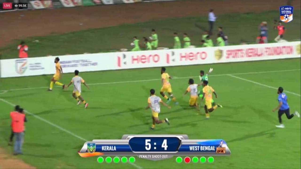 പെനല്റ്റി ഷൂട്ടൗട്ടില് രണ്ടാം കിക്കെടുത്ത ബംഗാളിന്റെ സജലിന് പിഴച്ചു. സജലിന്റെ കിക്ക് പുറത്തേക്ക് പോയപ്പോള് കേരളത്തിന്റെ കിക്കുകള് എല്ലാം ഗോളായി. ആതിഥേയരെന്ന നിലയില് കേരളത്തിന്റെ മൂന്നാം കിരീടവും 2018നുശേഷം ആദ്യ കിരീടനേട്ടമാണിത്.