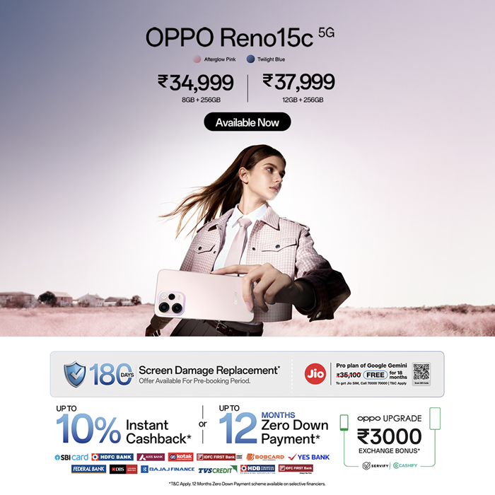 Reno15c-ന്റെ വില 8GB + 256GB വേരിയന്റിന് Rs. 34,999-ഉം 12GB + 256GB വേരിയന്റിന് Rs. 37,999-ഉം ആണ്.