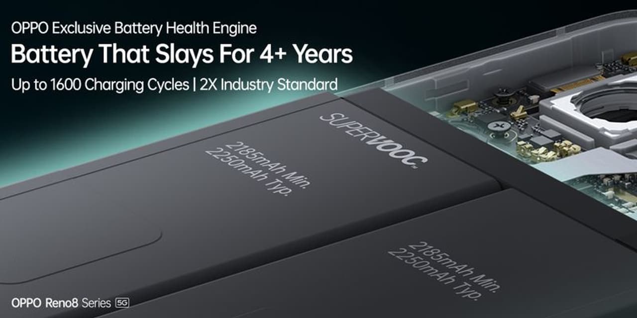 പെർഫോമൻസിൽ മികവ് തുടരുമ്പോഴും ബാറ്ററിയിൽ കോംപ്രമൈസ് വരുത്തിയിട്ടില്ല ഓപ്പോ എന്നത് ശ്രദ്ധേയമാണ്. ഫ്ലാഷ് ചാർജ് എന്ന അതിവേഗ ചാർജിങ് സംവിധാനം റെനോ8-ന് നൽകുന്നത് 80W SUPERVOOC ബാറ്ററിയാണ്. 4500 mAh ബാറ്ററി 50% ചാർജിൽ എത്താൻ വെറും 11 മിനിറ്റ് മതി. വെറും 28 മിനിറ്റിൽ ഫോൺ മുഴുവനായും ചാർജ് ആകും. സ്ഥിരതയുള്ള ബാറ്ററിയാണ് ഓപ്പോയുടെ വാഗ്ദാനം - 1,600 ചാർജിങ്ങുകൾക്ക് ഈ ബാറ്ററിക്ക് ശക്തിയുണ്ട്. നാല് വർഷം പീക് പെർഫോമൻസ് നൽകുന്ന Battery Health Engine സാങ്കേതികവിദ്യയാണ് ഓപ്പോ അവതരിപ്പിക്കുന്നത്.