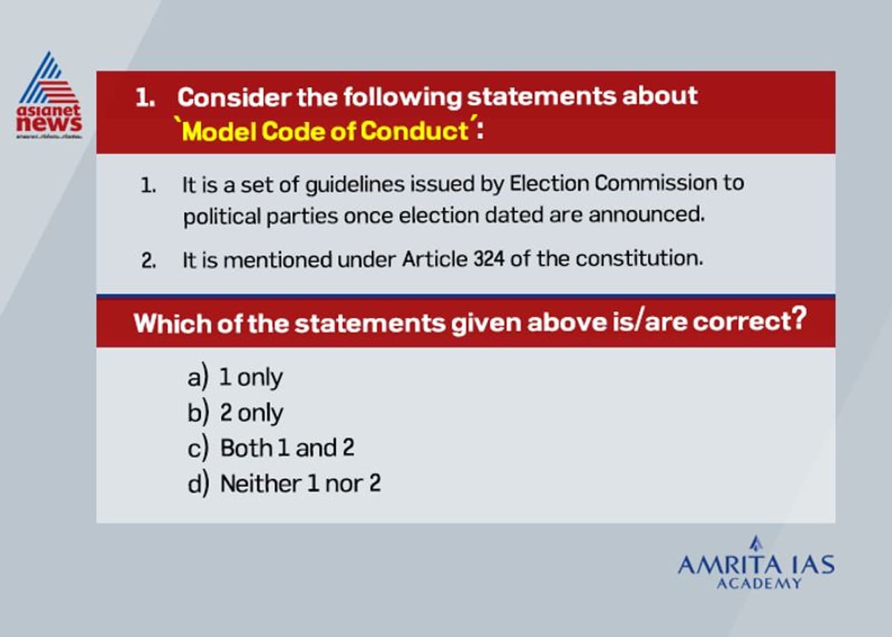 ഇന്ത്യന് ബ്യൂറോക്രസിയുടെ ഏറ്റവും ഉയര്ന്ന പദവികളിലേക്കുള്ള പരീക്ഷയായ സിവില് സര്വ്വീസ് പരീക്ഷയ്ക്കായി ഏഷ്യാനെറ്റ് ഓണ്ലൈനും അമൃത ഐഎഎസ് അക്കാദമിയും ചേര്ന്നൊരുക്കുന്ന ചോദ്യമാതൃകയുടെ പതിനെട്ടാം ഭാഗം.