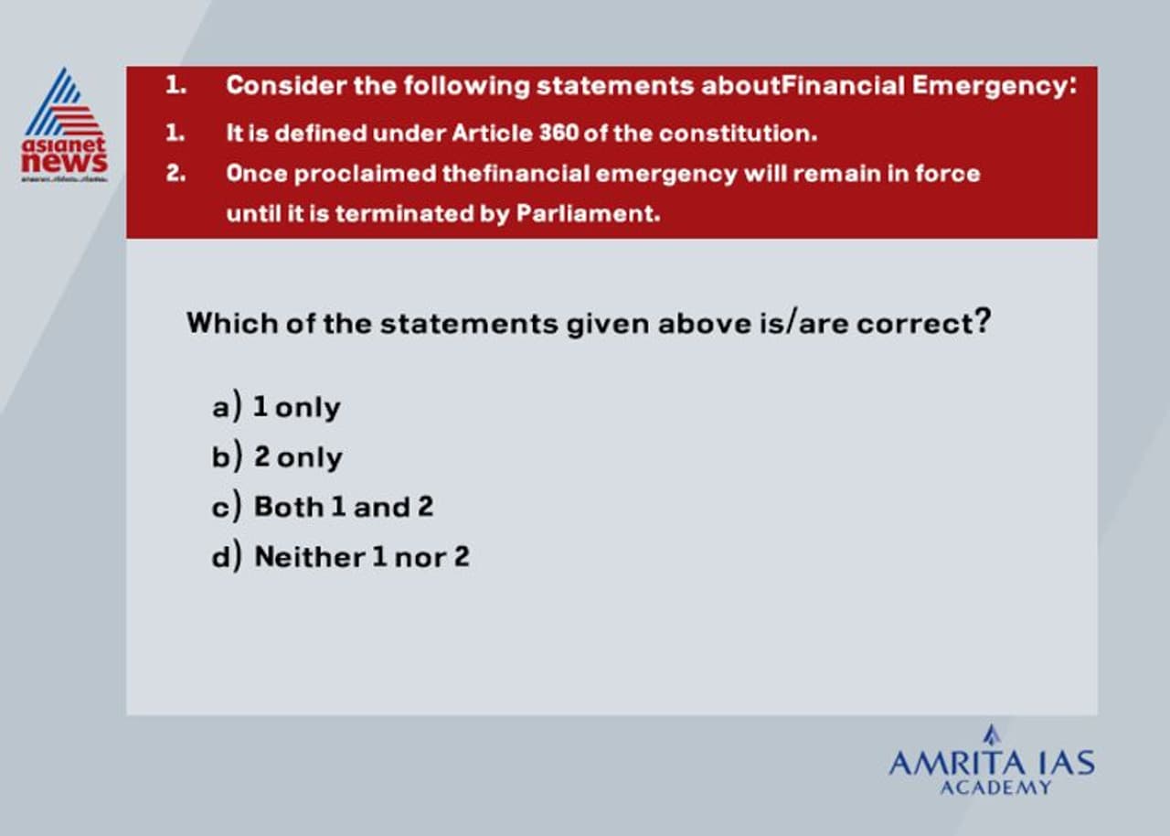 Article 360 empowers the President to proclaim financial emergency if he/she is satisfied that a situation has arisen due to which the financial stability or credit or any part of its territory is threatened.