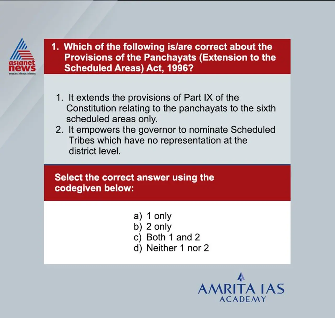 ഇന്ത്യന് ബ്യൂറോക്രസിയുടെ ഏറ്റവും ഉയര്ന്ന പദവികളിലേക്കുള്ള പരീക്ഷയായ സിവില് സര്വ്വീസ് പരീക്ഷയ്ക്കായി ഏഷ്യാനെറ്റ് ഓണ്ലൈനും അമൃത ഐഎഎസ് അക്കാദമിയും ചേര്ന്നൊരുക്കുന്ന ചോദ്യമാതൃകയുടെ എണ്പത്തിയൊന്നാം ഭാഗം.