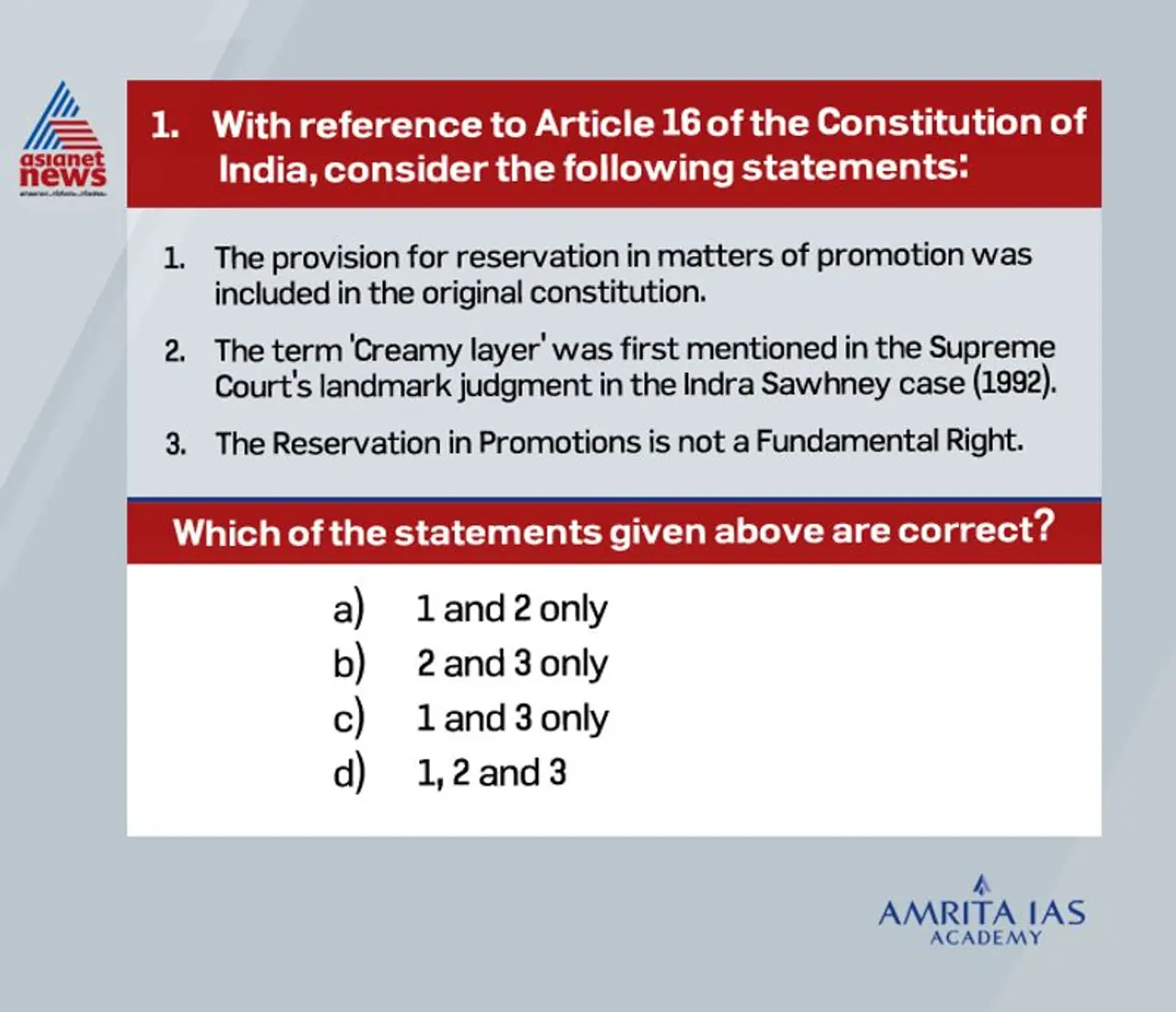 Article 16 (4A): Provides that the State can make any provision for reservation in matters of promotion in favor of the Scheduled Castes and the Scheduled Tribes if they are not adequately represented in the services under the State. It was inserted by the 77th Constitutional Amendment Act, 1995. Hence statement 1 is incorrect. The term ‘Creamy layer’ was first mentioned in the Supreme Court’s landmark judgment in the Indra Sawhney case (1992).