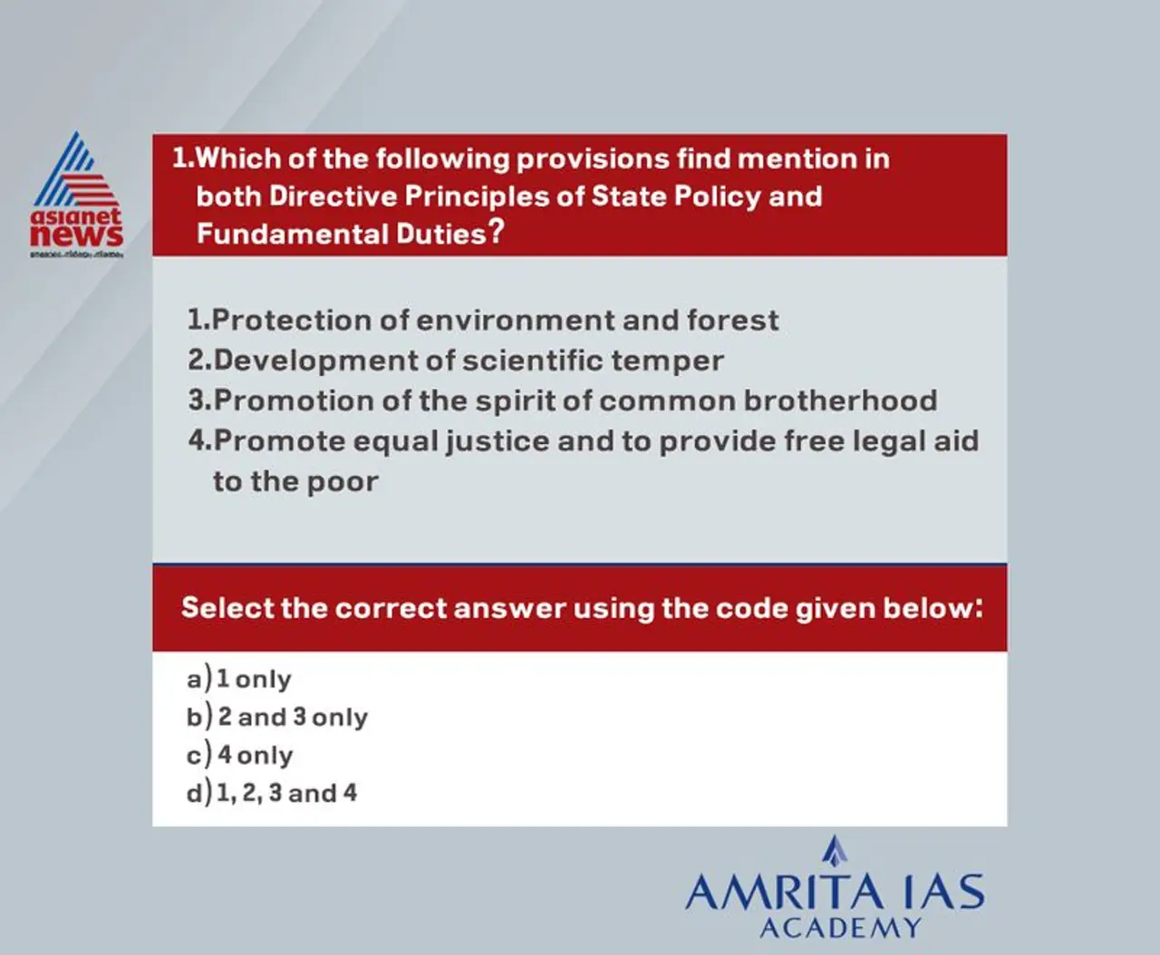ഇന്ത്യന് ബ്യൂറോക്രസിയുടെ ഏറ്റവും ഉയര്ന്ന പദവികളിലേക്കുള്ള പരീക്ഷയായ സിവില് സര്വ്വീസ് പരീക്ഷയ്ക്കായി ഏഷ്യാനെറ്റ് ഓണ്ലൈനും അമൃത ഐഎഎസ് അക്കാദമിയും ചേര്ന്നൊരുക്കുന്ന ചോദ്യമാതൃകയുടെ എണ്പതാം ഭാഗം.