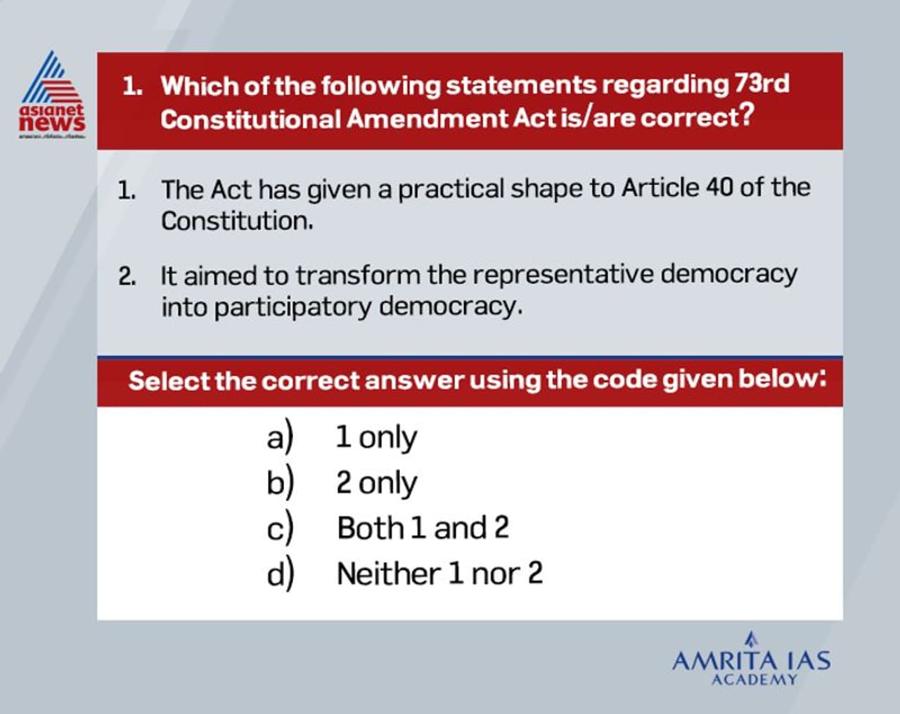 ഇന്ത്യന് ബ്യൂറോക്രസിയുടെ ഏറ്റവും ഉയര്ന്ന പദവികളിലേക്കുള്ള പരീക്ഷയായ സിവില് സര്വ്വീസ് പരീക്ഷയ്ക്കായി ഏഷ്യാനെറ്റ് ഓണ്ലൈനും അമൃത ഐഎഎസ് അക്കാദമിയും ചേര്ന്നൊരുക്കുന്ന ചോദ്യമാതൃകയുടെ അറുപത്തിയേഴാം ഭാഗം.