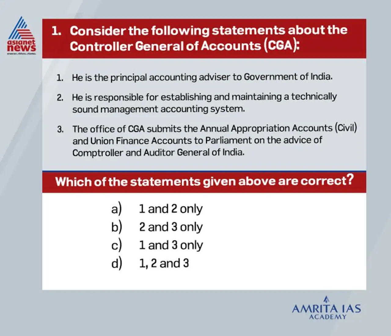 Statement 3 is correct. The Office of CGA prepares monthly and annual analyses of expenditure, revenues, borrowings, and various fiscal indicators for the Union Government. The Annual Appropriation Accounts (Civil) and Union Finance Accounts are submitted to Parliament on the advice of the Comptroller and Auditor General of India under Article 150 of the Constitution. Along with these documents, an M.I.S Report titled ‘Accounts at a Glance’ is prepared and circulated to Hon’ble Members of Parliament.
