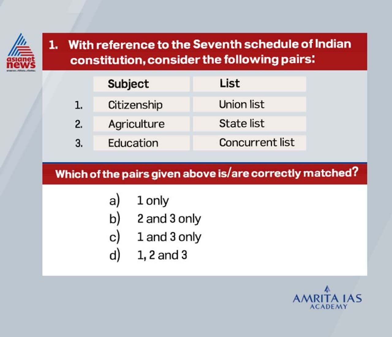 ഇന്ത്യന് ബ്യൂറോക്രസിയുടെ ഏറ്റവും ഉയര്ന്ന പദവികളിലേക്കുള്ള പരീക്ഷയായ സിവില് സര്വ്വീസ് പരീക്ഷയ്ക്കായി ഏഷ്യാനെറ്റ് ഓണ്ലൈനും അമൃത ഐഎഎസ് അക്കാദമിയും ചേര്ന്നൊരുക്കുന്ന ചോദ്യമാതൃകയുടെ നാല്പ്പത്തിയൊന്നാം ഭാഗം.