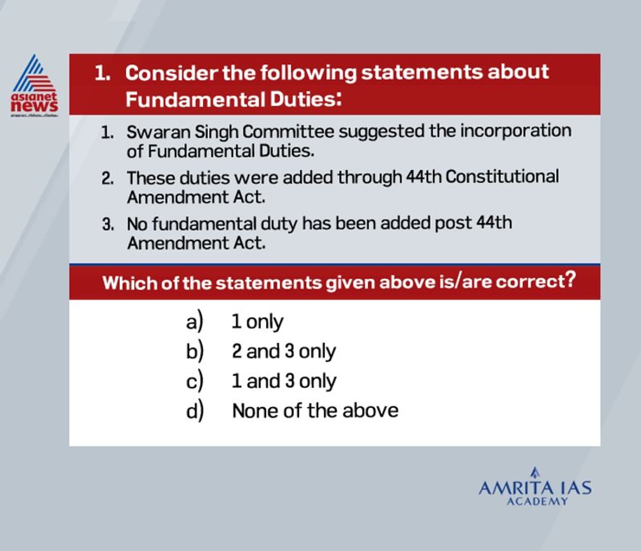 ഇന്ത്യന് ബ്യൂറോക്രസിയുടെ ഏറ്റവും ഉയര്ന്ന പദവികളിലേക്കുള്ള പരീക്ഷയായ സിവില് സര്വ്വീസ് പരീക്ഷയ്ക്കായി ഏഷ്യാനെറ്റ് ഓണ്ലൈനും അമൃത ഐഎഎസ് അക്കാദമിയും ചേര്ന്നൊരുക്കുന്ന ചോദ്യമാതൃകയുടെ നാല്പ്പത്തിരണ്ടാം ഭാഗം.