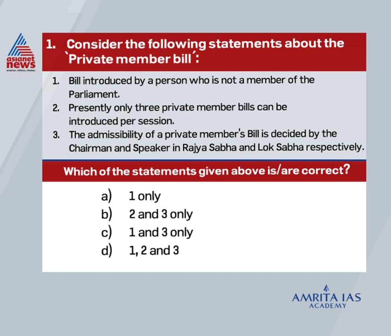 Statement 2 is correct. Up to 1997, private members could introduce up to three Bills in a week. This led to a piling up of Bills that were introduced but never discussed; Chairman K R Narayanan, therefore, capped the number of private member’s Bills to three per session. While government Bills can be introduced and discussed on any day, private member’s Bills can be introduced and discussed only on Fridays.