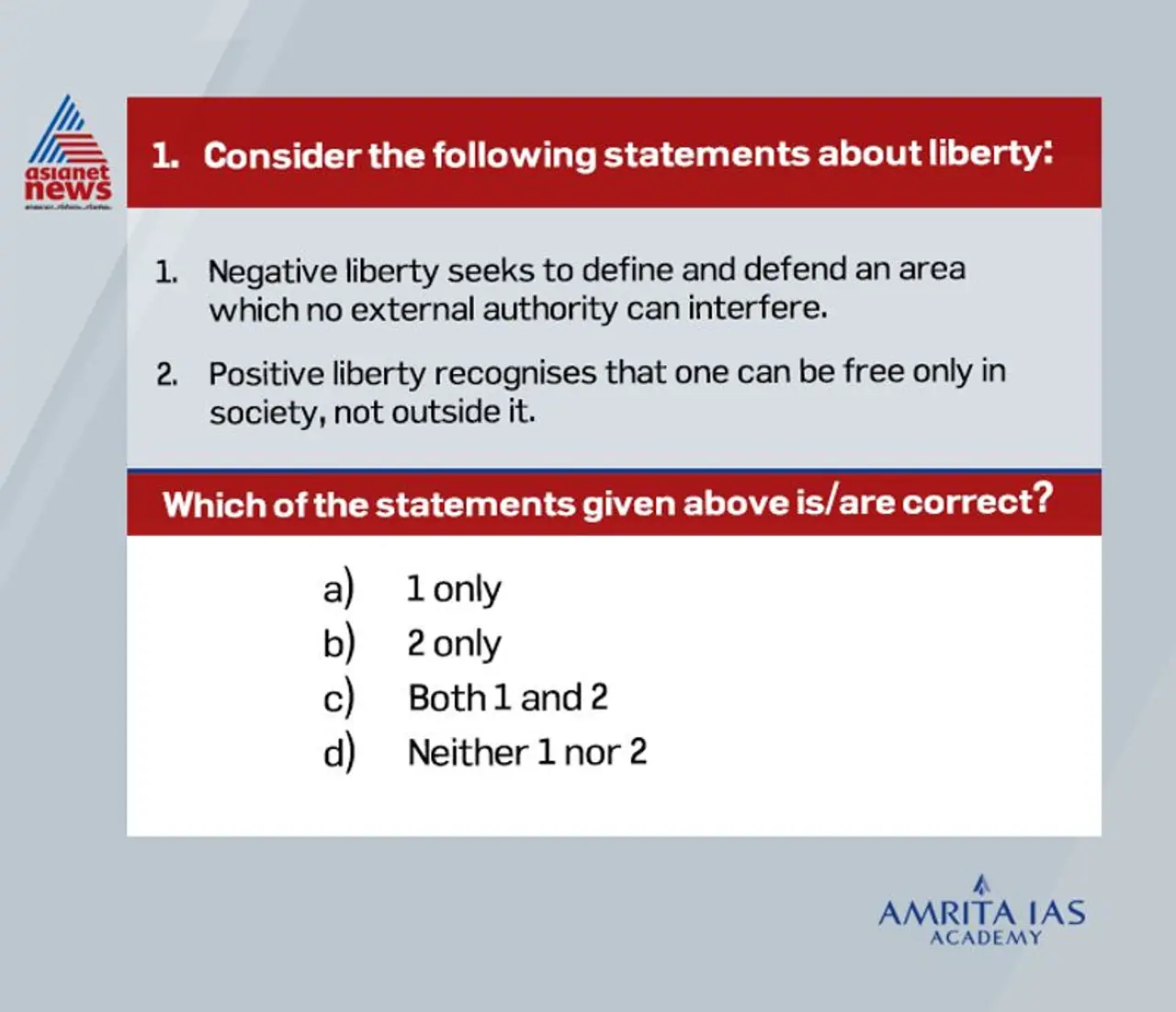 Statement 2 is correct. Positive liberty recognizes that one can be free only in society (not outside it) and hence tries to make that society such that it enables the development of the individual whereas negative liberty is only concerned with the inviolable area of non-interference and not with the conditions in society, outside this area, as such.