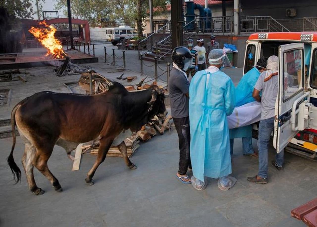 കൊവിഡ് ബാധിച്ച് മരിച്ച മണിനഗറിലെ ശ്രീ സ്വാമിനാരായണൻ ഗാഡി സൻസ്ഥാനിലെ പ്രധാന പുരോഹിതനായ പുരുഷോത്തം പ്രിയദാസ്ജി മഹാരാജിന്റെ അന്ത്യകർമങ്ങൾ അഹമദാബാദിൽ നടത്തുമ്പോൾ ചിതയ്ക്ക് ചുറ്റും കൂടിയിരിക്കുന്ന ഭക്തർ.