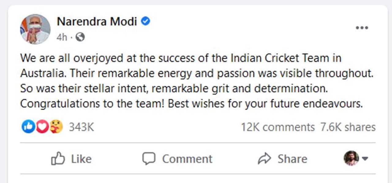 മോദി മുതല് മോഹന്ലാല് വരെ; ഗാബയിലെ ഓസീസ് കോട്ട തകര്ത്ത ടീം ഇന്ത്യക്ക് അഭിനന്ദനപ്രവാഹം