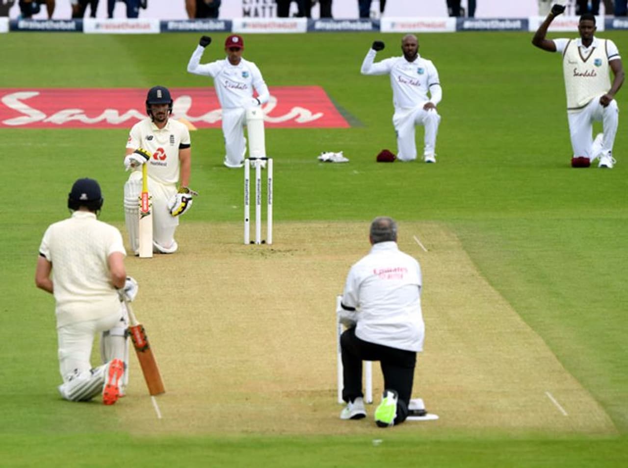 വംശീയാധിക്ഷേപത്തിനെതിരായ പ്രതിഷേധങ്ങള്ക്ക് ഇംഗ്ലണ്ടിന്റെയും വെസ്റ്റ് ഇന്ഡീസിന്റെയും താരങ്ങള് ഗ്രൗണ്ടില് മുട്ടുകുത്തി നിന്ന് മുഷ്ടി ഉയര്ത്തി ഐക്യദാര്ഢ്യം പ്രകടിപ്പിക്കുന്നു.