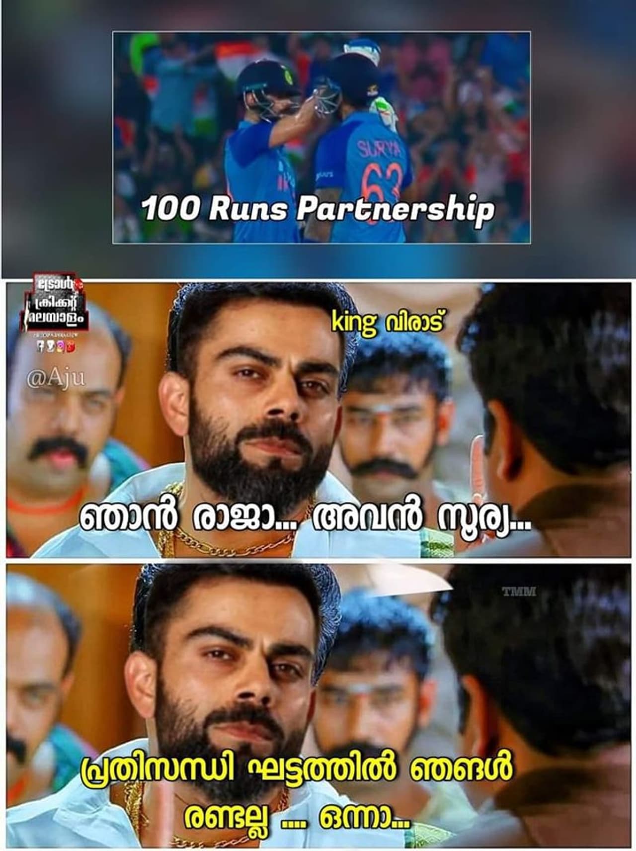 സൂര്യ കുമാര് യാദവിനെ ചെറുതല്ലാത്ത അഭിനന്ദന പ്രവാഹമെത്തി. 'ഞാന് രാജ, അവന് സൂര്യ' എന്ന പോക്കിരിരാജയിലെ സൂപ്പര് ഹിറ്റ് ഡയലോഗാണ് അതില് പ്രധാനം. ഇരുവരുടെയും ഇന്നിംഗ്സ് ആണ് ഇന്നലെ ഇന്ത്യയെ വിജയ വഴിയിലെത്തിച്ചത്.