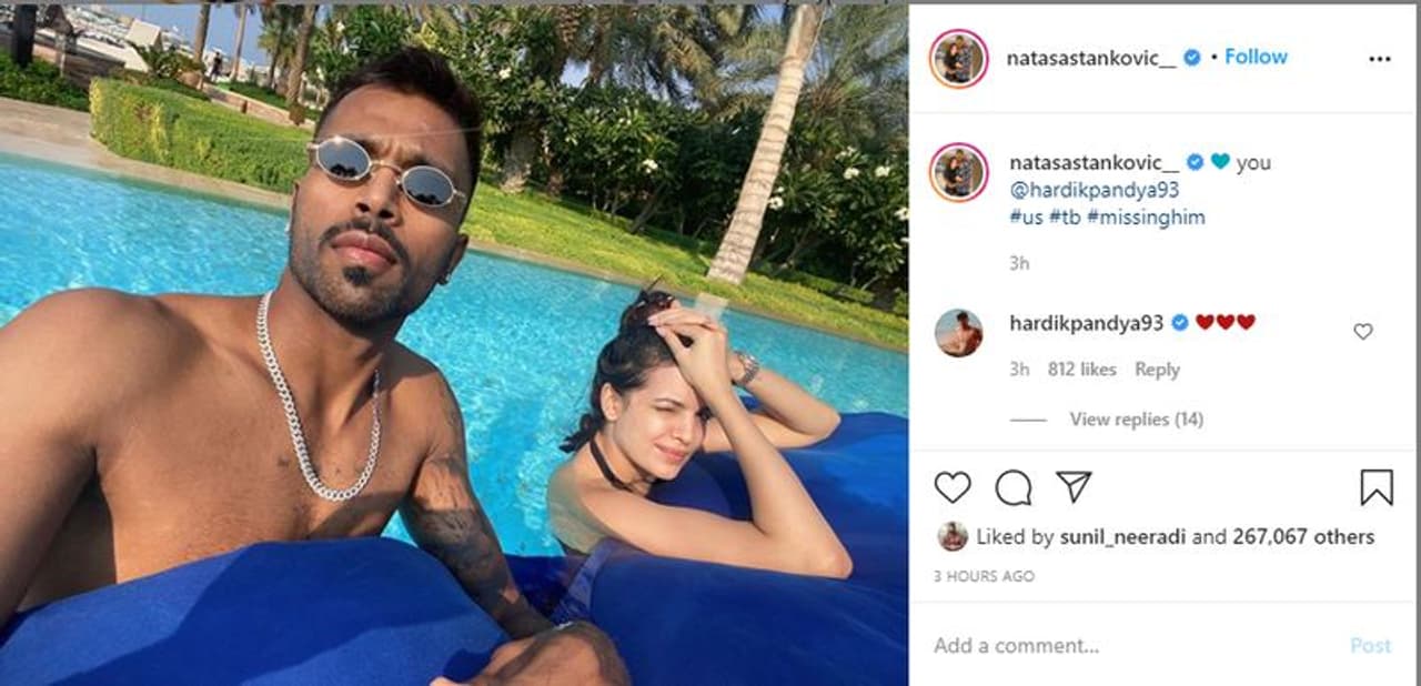 ഇന്സ്റ്റഗ്രാമിലാണ് പാണ്ഡ്യക്കൊപ്പം നിന്തല്ക്കുളത്തിലുള്ള ചിത്രം നടാഷ പങ്കുവെച്ചത്. #missinghim എന്ന ഹാഷ്ടാഗോടെയായിരുന്നു പോസ്റ്റ്.