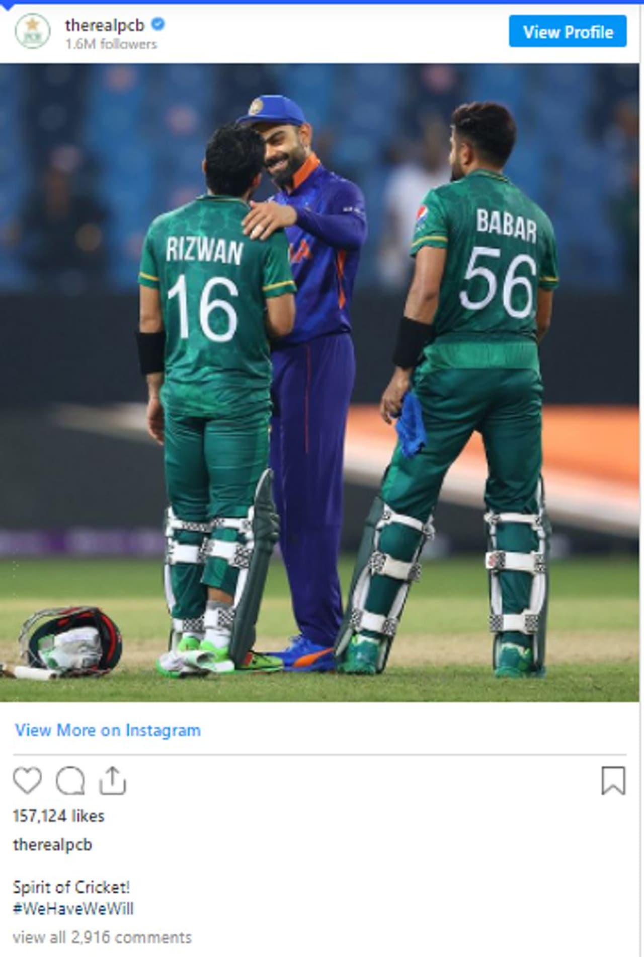 ബാബറിനെയും റിസ്വാനേയും കോലി അഭിനന്ദിക്കുന്ന ചിത്രം പങ്കുവെച്ചുകൊണ്ട് പാകിസ്ഥാന് ക്രിക്കറ്റ് ബോര്ഡിന്റെ ട്വീറ്റിങ്ങനെ. 'സ്പിരിറ്റ് ഓഫ് ക്രിക്കറ്റ്' എന്നാണ് ചിത്രത്തിന് നല്കിയ തലക്കെട്ട്.