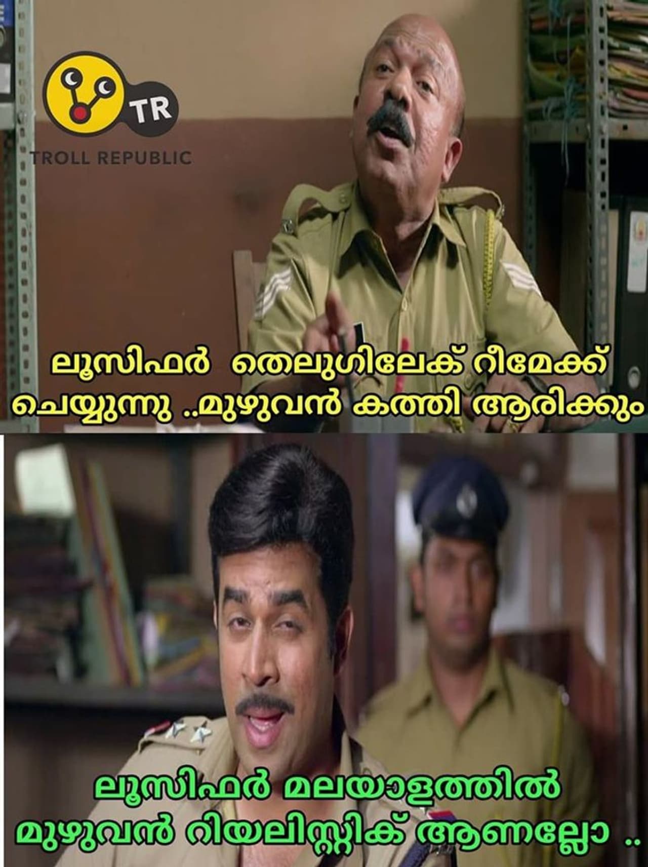 രാഷ്ട്ര-ദേശ ഭാഷാ വിവാദങ്ങള് ഇന്ത്യയില് വീണ്ടും ശക്തമായ സമയത്താണ് പൃത്ഥിരാജ് സംവിധാനം ചെയ്ത മോഹന്ലാല് ചിത്രം ലൂസിഫര് തെലുങ്കിലേക്ക് റിമേയ്ക്ക് ചെയ്യുന്നുവെന്ന വാര്ത്തകള് പുറത്ത് വരുന്നത്. ഭാഷയിലും സിനിമാ സംവിധാന-ആസ്വാദനത്തിലുമെല്ലാം ശക്തമായ വ്യത്യസങ്ങള് പുലര്ത്തുന്ന രണ്ട് ദേശഭാഷകളാണ് മലയാളവും തെലുങ്കും. ഭാഷാപരമായ വ്യത്യാസങ്ങളോടൊപ്പം ആസ്വാദനത്തിലെ വ്യത്യസങ്ങളെയും അടിസ്ഥാനപ്പെടുത്തി ട്രോളന്മാര് ലൂസിഫറുമായാണ് ഇത്തവണ രംഗം കൊഴുപ്പിക്കുന്നത്. മോഹന്ലാലിന്റെ ചെയ്ത നായക കഥാപാത്രം അഭിനയിക്കുന്നത് ചിരഞ്ജീവിയാണ്. കാണാം ലൂസിഫര് ട്രോളുകള്.