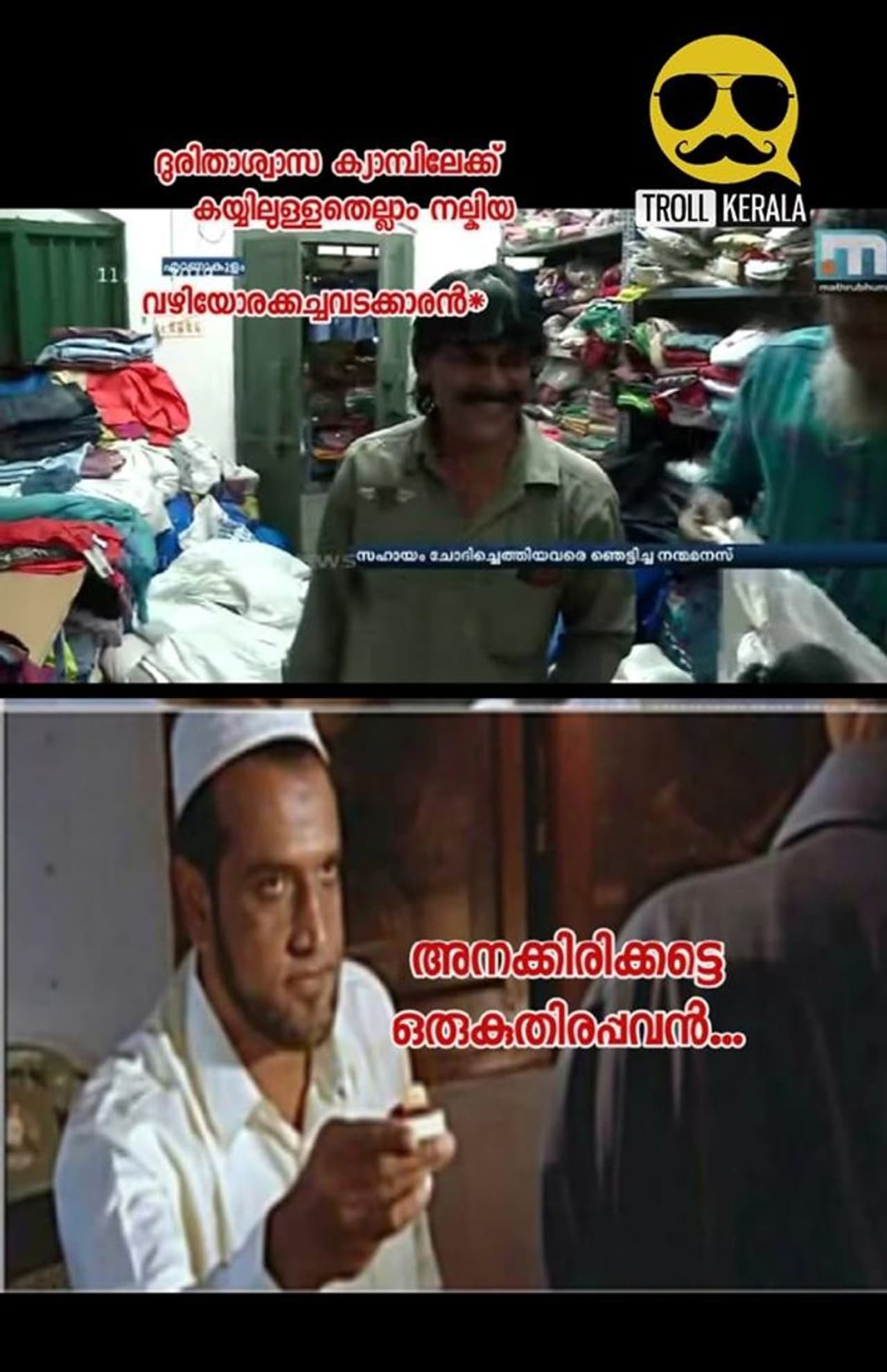 കേരളം തുടര്ച്ചയായി രണ്ടാമത്തെ പ്രളയത്തെ നേരിട്ടപ്പോള് ആദ്യം പ്രചരിച്ചത്, മുഖ്യമന്ത്രിയുടെ ദുരിതാശ്വാസ നിധിയിലേക്കടക്കം സഹായം നല്കരുതെന്നായിരുന്നു. പിന്നാലെ വടക്കന് / തെക്കന് ഭിന്നിപ്പുകളുമെത്തി. എന്നാല് ഇതിനിടെ ലോകത്തെ മൊത്തം ഞെട്ടിച്ച് കൊച്ചി ബ്രോഡ് വേയിലെ വഴിയോര കച്ചവടക്കാരന് നൗഷാദ് രംഗത്തെത്തി. അന്നന്നത്തെ അപ്പത്തിനായി റോഡരികില് തുണി വില്പ്പന ചെയ്ത് കഴിയുന്ന നൗഷാദ് റോഡില് നില്ക്കുമ്പോഴാണ് വയനാട്ടിലേ ദുരിതാശ്വാസ ക്യാമ്പിലേക്ക് കുട്ടികള് സഹായാഭ്യര്ത്ഥനയുമായെത്തുന്നത്. പലരും കുട്ടികളെ നിരാശയോടെ മടക്കിയയച്ചപ്പോള്, നൗഷാദ് അവരെ സ്വന്തം കടയിലേക്ക് വിളിച്ച് കൊണ്ട് പോയി, ആവശ്യമുള്ളതെല്ലാം എടുത്തോളാന് പറയുകയായിരുന്നു. അവസാനം വന്നവര് പിന്തിരിയുന്നത് വരെ, അദ്ദേഹം തന്റെ കടയിലുള്ള സാധനങ്ങള് വയനാട്ടിലെ ദുരിതബാധിതര്ക്കായി കൊടുത്തു. അതെ നൗഷാദ് കാട്ടിത്തന്ന വഴിയാണ് പിന്നീട് മുഖ്യമന്ത്രിയുടെ ദുരിതാശ്വാസ നിധിയിലേക്കടക്കം പണമൊഴുകാന് പ്രേരണയായത്. നൗഷാദിനെ വച്ചുള്ള മീമുകള് കാണാം.