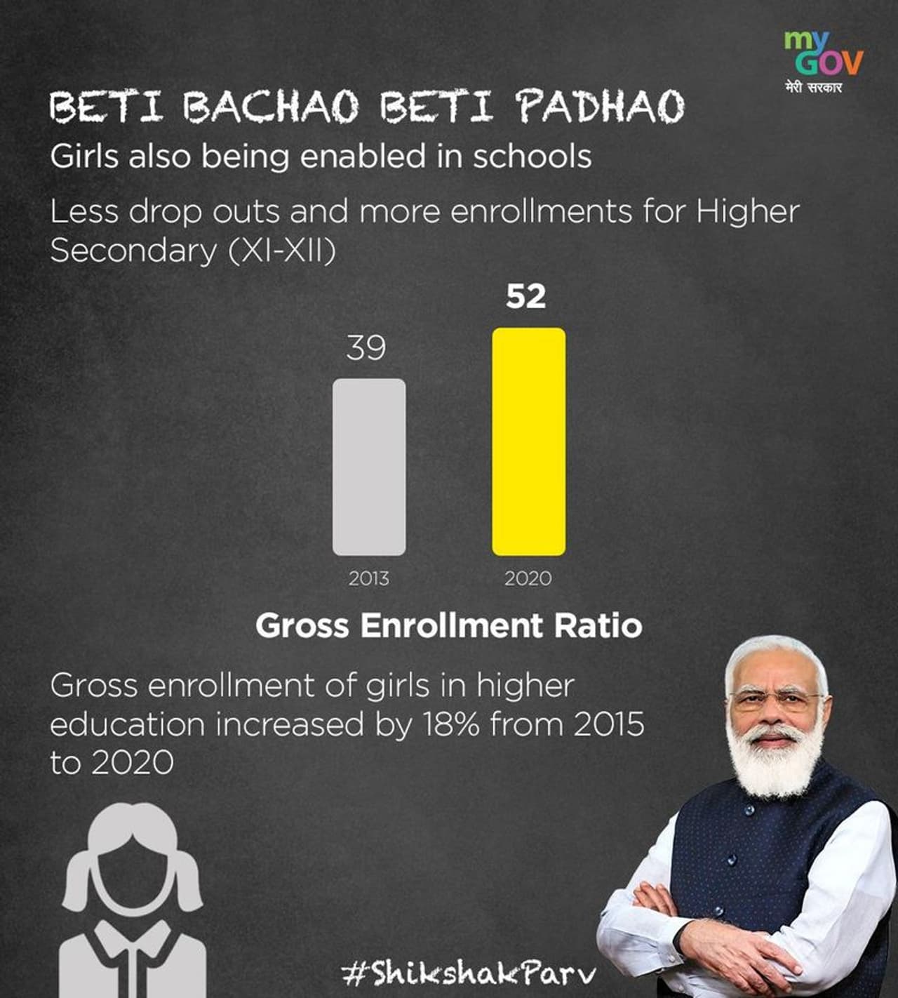 ബേട്ടി ബച്ചാവോ ബേട്ടി പഠാവോ: ഹൈസ്കൂളിലെത്തി ചേര്ന്ന് പിന്നീട് പഠനം നിര്ത്തി പോകുന്ന കുട്ടികളുടെ എണ്ണത്തില് ഗണ്യമായ കുറവുണ്ടായി. 2015 ല് നിന്ന് 2020 ലെത്തുമ്പോള് ഹൈസ്ക്കൂളില് ചേരുന്ന കുട്ടികളുടെ എണ്ണത്തില് 18 ശതമാനത്തിന്റെ വര്ദ്ധനവുണ്ടായി.