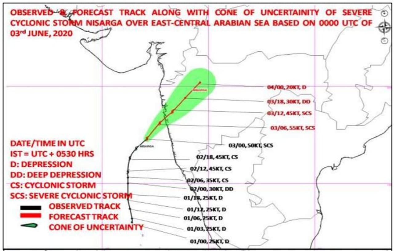 കൊവിഡും വെട്ടുക്കിളിയും രൂക്ഷമായ അക്രമണം അഴിച്ച് വിട്ട രണ്ട് ഇന്ത്യന് സംസ്ഥാനങ്ങളായ മഹാരാഷ്ട്രയിലും ഗുജറാത്തിലുമാണ് അറബിക്കടിലില് നിന്ന് ഉരുവം കൊണ്ട നിസര്ഗ ആഞ്ഞടിക്കാനായി തയ്യാറെടുക്കുന്നത്. (ചിത്രത്തില് നിസര്ഗ ചുഴലിക്കാറ്റിന്റെ സഞ്ചാരപഥം.)