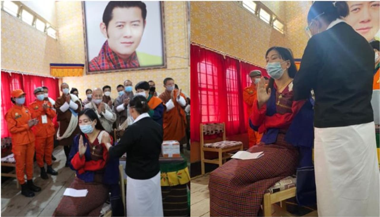 നിന്ഡ ഡേമ എന്ന മുപ്പതുകാരിയാണ് ഇപ്രകാരം ഭൂട്ടാനില് കൊവിഡ് വാക്സിന് സ്വീകരിക്കുന്ന ആദ്യത്തെ ആള്. തിംപുവിലെ സ്കൂളില് സജ്ജമാക്കിയ വാക്സിനേഷന് ക്യാംപില് നിന്നാണ് നിന്ഡ ഡേമ വാക്സിന് സ്വീകരിച്ചത്.