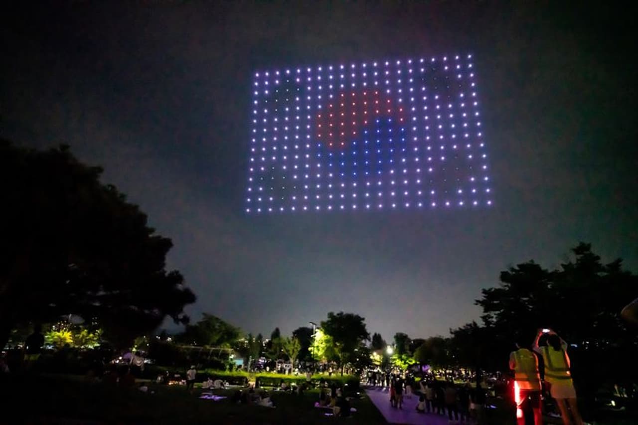 പുറകെ "കൊറിയൻ റിപ്പബ്ലിക്ക്, ധൈര്യമായിരിക്കുക" എന്ന സന്ദേശവുമെത്തി. പരിപാടിക്കായി തയ്യാറാക്കി വെച്ചിരിക്കുന്ന ഡ്രോണുകള്.