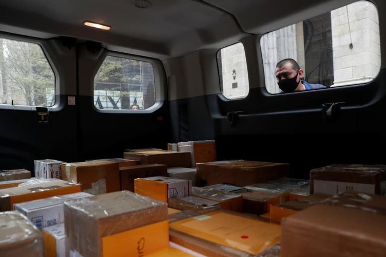 കൊവിഡ് ബാധിച്ച് മെക്സിക്കോയിൽ മരിച്ചവരുടെ അവശേഷിപ്പുകൾ സെന്റ് പാട്രിക്സ് കത്തീഡ്രലിൽ നടന്ന പ്രാർത്ഥനാ ശുശ്രൂഷയ്ക്ക് എത്തിച്ചപ്പോൾ. വണ്ടിയിൽ സൂക്ഷിച്ചിരിക്കുന്ന പെട്ടികളിൽ തന്റെ ഭാര്യയുടേത് തിരയുന്ന യുവാവിനെയും കാണാം.