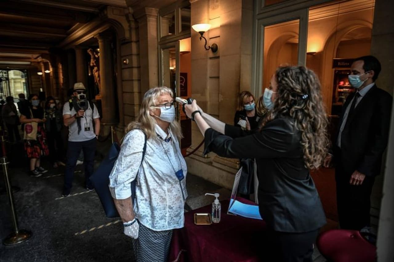 പാരീസിലെ ജാക്ക്മാർട്ട് ആന്ദ്രേ മ്യൂസിയത്തിൽ എത്തിയ സന്ദർശകരുടെ താപനില പരിശോധിക്കുന്ന ഗാലറി ജീവനക്കാരി