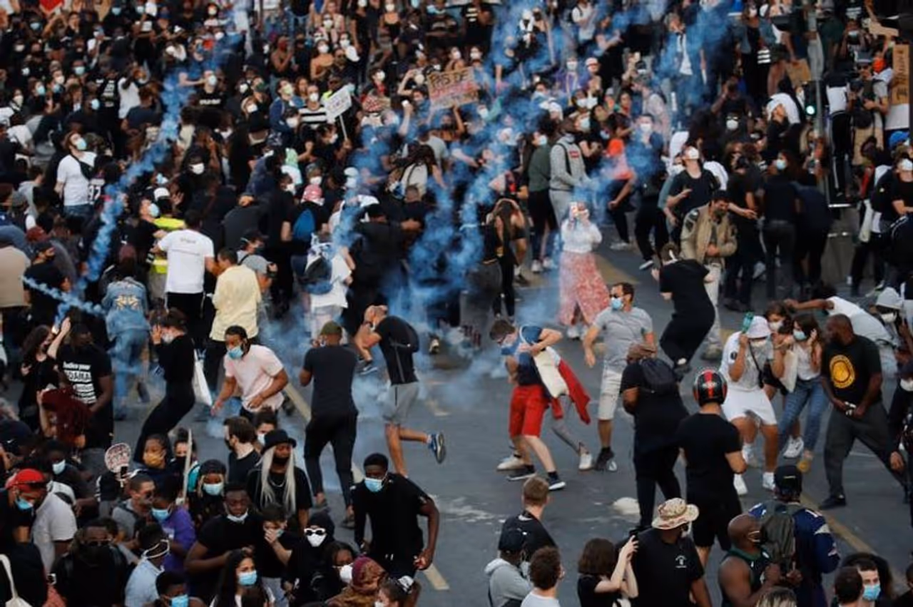 പാരീസിലെ കോർട്ട് ഹൗസിനു മുന്നിൽ 2016ൽ അഡാമാ ട്രോർ എന്ന കറുത്ത വർഗക്കാരനായ ഫ്രഞ്ച് പൗരനെ പൊലീസ് കൊലപ്പെടുത്തിയതിൽ പ്രതിഷേധിച്ച് സമരം ചെയ്യാൻ എത്തിയവർക്ക് നേരെ പൊലീസ് കണ്ണീർവാതകം പ്രയോഗിക്കുന്നു. കഴിഞ്ഞ ദിവസം അമേരിക്കൻ പൊലീസ് കഴുത്തു ഞെരിച്ചു കൊന്ന കറുത്തവർഗക്കാരനായ ജോർജ് ഫ്ലോയിഡിന്റെ കൊലപാതകത്തിലും ജനങ്ങൾ പ്രതിഷേധം രേഖപ്പെടുത്തി.