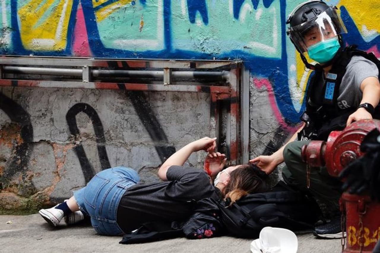 ചെെന ഹോങ്കോങിനുമേൽ പാസ്സാക്കിയ ദേശീയ സുരക്ഷാ നിയത്തിൽ പ്രതിഷേധിച്ച് തെരുവിലിയങ്ങിയ പ്രക്ഷോഭകരിൽ ഒരാളായ സ്ത്രീയെ ആക്രമിക്കുന്ന പൊലീസ് ഉദ്യോഗസ്ഥൻ.