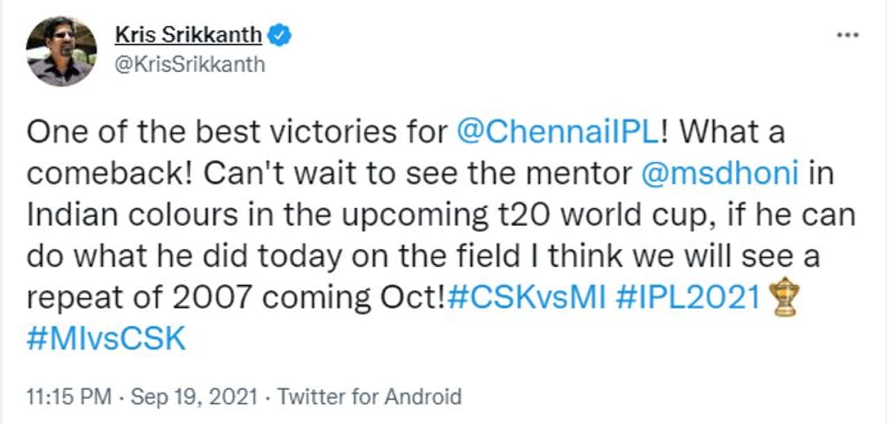 ദുബൈ: ഐപിഎൽ പതിനാലാം സീസണിന്റെ രണ്ടാംഘട്ടത്തിലെ ആദ്യ മത്സരത്തില് വമ്പന് തിരിച്ചുവരവിലാണ് മുംബൈ ഇന്ത്യൻസിനെ ചെന്നൈ സൂപ്പർ കിംഗ്സ് വീഴ്ത്തിയത്. ഇരുപത് റൺസിനായിരുന്നു ധോണിപ്പടയുടെ വിജയം. ചെന്നൈയുടെ 156 റൺസ് പിന്തുടർന്ന മുംബൈയ്ക്ക് 136 റൺസിൽ എത്താനേ കഴിഞ്ഞുള്ളൂ. തുടക്കത്തില് 24 റണ്സിന് നാല് വിക്കറ്റ് നഷ്ടമായ ശേഷമായിരുന്നു ധോണിപ്പട മാന്യമായ സ്കോറിലേക്കെത്തിയത്. ചെന്നൈയുടെ ത്രസിപ്പിക്കുന്ന ജയത്തെയും ഓപ്പണര് റുതുരാജ് ഗെയ്ക്വാദിന്റെ ക്ലാസിക് പോരാട്ടത്തേയും മുന് താരങ്ങള് ഉള്പ്പടെ പ്രശംസകൊണ്ട് മൂടി.