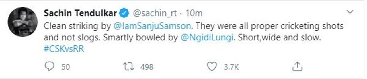 ക്രിക്കറ്റ് ആരാധകര് സഞ്ജുവിന്റെ പ്രകടനത്തെ പ്രംശസിച്ച് രംഗത്തെത്തി. ചെന്നൈയുടെ ലോകോത്തര ബൗളിംഗ് നിരയെയാണ് സഞ്ജു കൈകാര്യം ചെയ്തതെന്ന് പലരും അഭിപ്രായപ്പെട്ടു. സഞ്ജു പുറത്തായിരുന്നില്ലെങ്കില് മറ്റൊരു സിക്സര് പൂരം കാണാമെന്നായിരുന്നു പലരുടെയും അഭിപ്രായം.