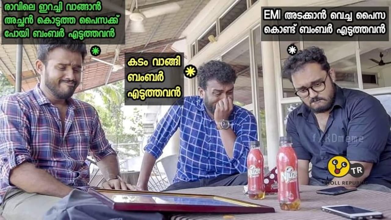കാറിന്റെ ബമ്പര് ഇടിച്ചെന്ന് വീട്ടില് വിളിച്ച് പറഞ്ഞ്, തിരിച്ച് വീട്ടിലെത്തുമ്പോള് 'ബമ്പറ് അടിച്ച' ആളെ കാണാനെത്തിയ കാഴ്ചകളും ട്രോളന്മാരുടെ ഭാവനയില് വിരിഞ്ഞു. അഞ്ചൂറ് രൂപ പോയവരുടെ ഇടയിലേക്ക് അര്മ്മാദിച്ചെത്തുന്ന ടിക്കറ്റെടുക്കാത്തവരും കുറവല്ലായിരുന്നു.