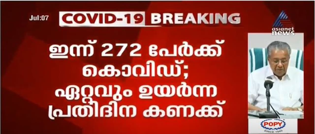 സംസ്ഥാനത്ത് ഇന്ന് (7.6.2020) 272 പേര്ക്ക് കൂടി കൊവിഡ് സ്ഥിരികരിച്ചതോടെ മൊത്തം ചികിത്സയിലുള്ളവരുടെ എണ്ണം 2411 ആയി. ഇന്ന് 111 പേര് രോഗമുക്തരായി. സമ്പര്ക്കം വഴി 68 പേര്ക്ക് രോഗം സ്ഥിരീകരിച്ചത് കനത്ത ആശങ്കയ്ക്ക് ഇടയാക്കിയിട്ടുണ്ട്.11 ജില്ലകളിലാണ് ഇന്ന് മാത്രം പത്തിലേറെ പുതിയ കേസുകള് റിപ്പോര്ട്ട് ചെയ്തത്. മലപ്പുറം 63, തിരുവനന്തപുരം 54, പാലക്കാട് 29, കണ്ണൂർ 19, ആലപ്പുഴ 18, കോഴിക്കോട് 15, കാസർഗോഡ് 13, പത്തനംതിട്ട 12,കൊല്ലം 11, തൃശൂർ 10, കോട്ടയം 3 ,വയനാട് 3, ഇടുക്കി 1 എന്നിങ്ങനെയാണ്.പുതിയതായി 18 ഹോട്ട് സ്പോട്ടുകൾ കൂടി പ്രഖ്യാപിച്ചതോടെ എണ്ണം 169 ആയെന്നും മുഖ്യമന്ത്രി വിശദീകരിച്ചു. രോഗലക്ഷണം കാട്ടിയ 378 പേരെ ഇന്ന് മാത്രം ആശുപത്രിയിലാക്കിയിട്ടുണ്ടെന്നും അദ്ദേഹം വ്യക്തമാക്കി. മുഖ്യമന്ത്രി പറഞ്ഞ പ്രധാനകാര്യങ്ങള് ചുവടെ