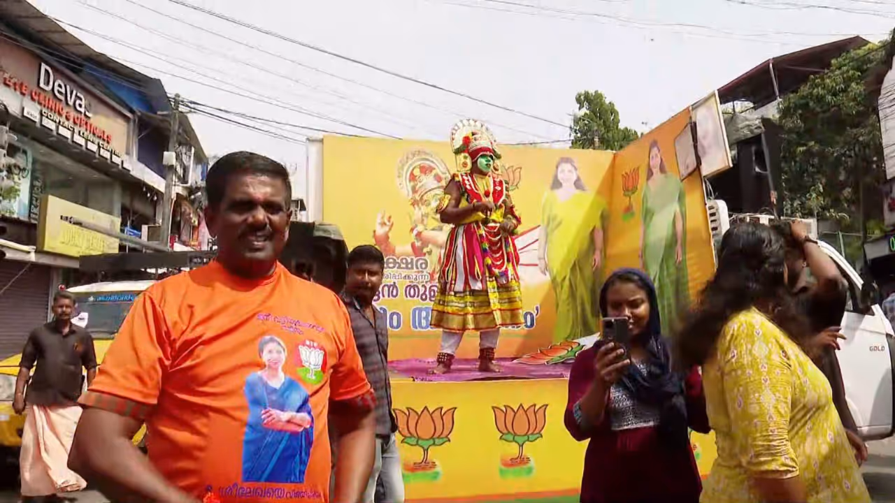 വട്ടിയൂർക്കാവ് നിയോജക മണ്ഡലം എൻഡിഎ സ്ഥാനാർഥി ആർ ശ്രീലേഖയുടെ പ്രചരണത്തിന് ഓട്ടൻ തുള്ളലുമായി കൊട്ടി കലാശത്തിനെത്തിയ പ്രവർത്തകർ.