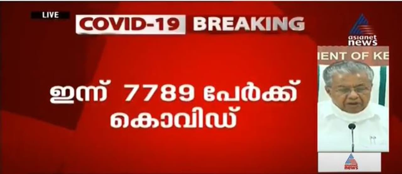 കേരളത്തില് ഇന്ന് 7789 പേര്ക്ക് കൊവിഡ്-19 സ്ഥിരീകരിച്ചതോടെ മൊത്തം ചികിത്സയിലുള്ളവരുടെ എണ്ണം 94,517 ആയി. തലസ്ഥാനത്ത് രോഗവ്യാപനം കുറഞ്ഞപ്പോള് രണ്ട് ജില്ലകളിൽ രോഗബാധ അതിതീവ്രമാകുകയാണെന്ന് മുഖ്യമന്ത്രി വാർത്താസമ്മേളനത്തിൽ വ്യക്തമാക്കി. 1264 കേസുകൾ സ്ഥിരീകരിച്ച കോഴിക്കോടും 1209 കേസുകൾ സ്ഥിരീകരിച്ച എറണാകുളത്തും കാര്യങ്ങള് സങ്കീർണമാണ്. ഇടക്കാലത്ത് എല്ലാ ദിവസവും ആയിരത്തിലേറെ കേസുകളുണ്ടായിരുന്ന തിരുവനന്തപുരത്ത് 679 പുതിയ കേസുകളാണ് റിപ്പോർട്ട് ചെയ്തത്. ദശലക്ഷത്തിൽ രോഗം സ്ഥിരീകരിക്കുന്നവരുടെ എണ്ണത്തിൽ കേരളം ആശങ്കപ്പെടേണ്ട കണക്കുകളാണ് പുറത്തുവരുന്നതെന്ന് മുഖ്യമന്ത്രി വ്യക്തമാക്കി. ദശലക്ഷത്തിൽ 8911 പേര്ക്കാണ് കേരളത്തിൽ രോഗം സ്ഥിരീകരിക്കുന്നത്. ഇത് ദേശീയ ശരാശരിയെക്കാളും മുകളിലാണെന്നും മുഖ്യമന്ത്രി കൂട്ടിച്ചേർത്തു. കേരളത്തിലെ ടെസ്റ്റ് പോസിറ്റിവിറ്റി നിരക്ക് 15.53 ശതമാനമാണ്. മുഖ്യമന്ത്രി പറഞ്ഞ പ്രധാനകാര്യങ്ങള് ചുവടെ